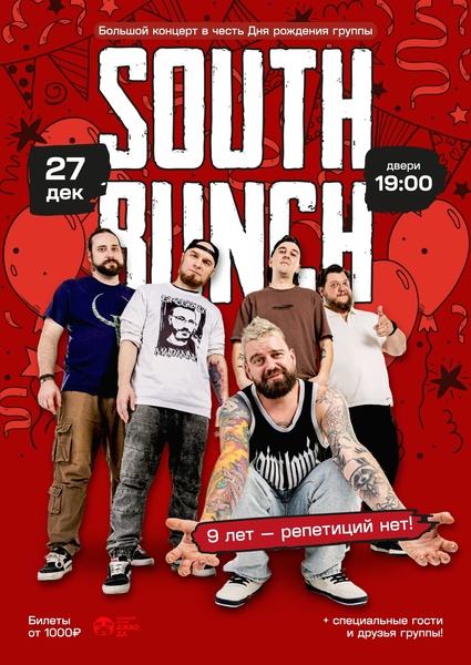 27-го декабря,в последнюю субботу уходящего года, главные мазафакеры столицы, группа SOUTH BUNCH, празднует свой 9-й день рождения!!!