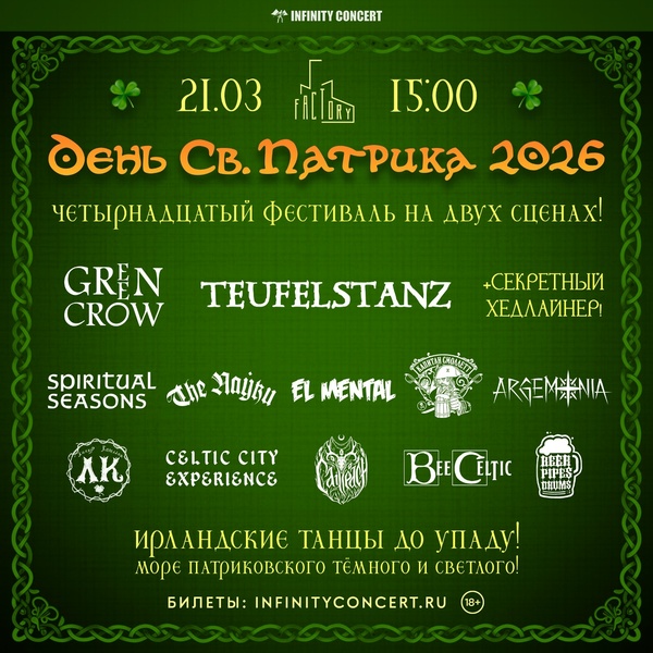 В этом году традиционный, 14-й по счёту, фестиваль День святого Патрика снова пройдёт в клубе Factory 3 на двух сценах — с 15:00 до 23:30 - мы ждём всех к началу, друзья!
