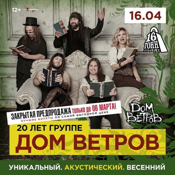 ДОМ ВЕТРОВ приглашают на УНИКАЛЬНЫЙ АКУСТИЧЕСКИЙ ВЕСЕННИЙ концерт - 16 АПРЕЛЯ, КЛУБ '16 ТОНН. АРБАТ'