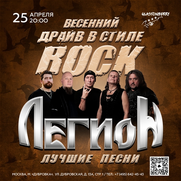 25 апреля в 20:00 в клубе Glastonberry группа Легион представит программу «Весенний драйв в стиле ROCK». Это тот случай, когда хочется выключить телефон, забыть о буднях и просто врубить звук на полную.