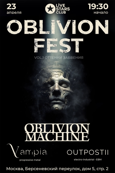 OBLIVION FEST призван объединять под своим началом мощные андерграундные формации — группы и проекты, которые не оставят равнодушным ни одного ценителя честной и независимой музыки. Это тайное общество хранителей смыслов и идеалов тяжелого жанра в России. Присоединяйся к нам, приходи на концерты OBLIVION FEST, становись участником священных ритуалов, наполненных богатым визуалом и громким звуком!