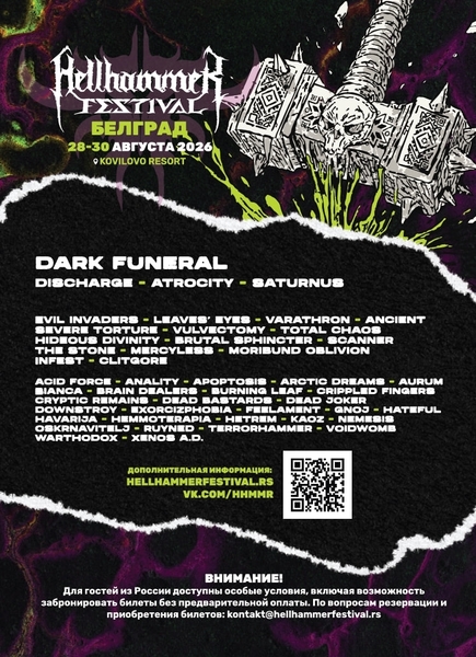 Трёхдневные абонементы и однодневные билеты уже в продаже через официальные точки (книжные магазины Vulkan в Сербии) и онлайн по ссылке: https://new.gigstix.com/event/hellhammer-open-air-festival-beograd-avgust-2026/