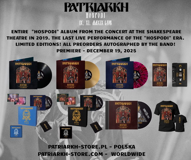 Польские блэк-металлисты PATRIARKH, ранее представлявшие собой одну из версий скандального коллектива BATUSHKA, ведомую вокалистом Барфоломеем “Бартом” Крысюком (Bartłomiej “Bart” Krysiuk), выпустили концертник "Hospodi IX.XI.MMXIX Live", который представляет собой полное живое исполнение альбома “Hospodi” (2019). Цифровое издание релиза вышло на лейбле Witching Hour, а издания на CD, кассетах и 12-дюймовом виниле осуществили Via Nocturna Records. Дата релиза всех версий - 19 декабря.