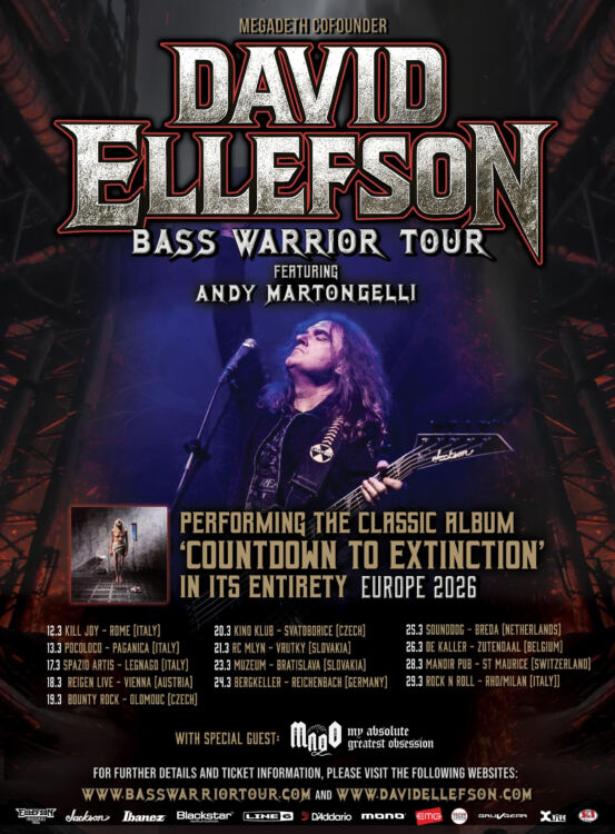 Бывший басист MEGADETH Дэвид Эллефсон (David Ellefson) поедет в сольный европейский тур "Bass Warrior" в марте. В этом туре Эллефсон и его аккомпанирующий состав будут исполнять хорошо известные хиты MEGADETH, в том числе весь альбом "Countdown To Extinction", плюс сольный материал Дэвида и кавера на песни, которые вдохновляли его на протяжении 40-летней музыкальной карьеры. На разогреве будет выступать группа MADO.