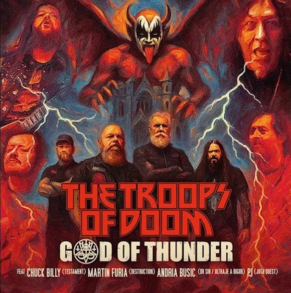 Бразильская группа THE TROOPS OF DOOM, в которой играет бывший гитарист SEPULTURA Жайро “Торментор” Гуэдз (Jairo "Tormentor" Guedz), решила отпраздновать шестилетие своего существования выпуском кавер-версии на классическую песню KISS "God Of Thunder". Вместе с участниками группы в студию также были приглашены гостевые музыканты различных направлений - Чак Билли (Chuck Billy) из TESTAMENT, Андрия Бузич (Andria Busic, DR. SIN, ULTRAJE A RIGOR), Пи-Джей (PJ, JOTA QUEST) и Мартин Фуриа (Martin Furia, DESTRUCTION, BARK). Последний не только записал гитарное соло, но и занимался сведением и мастерингом.