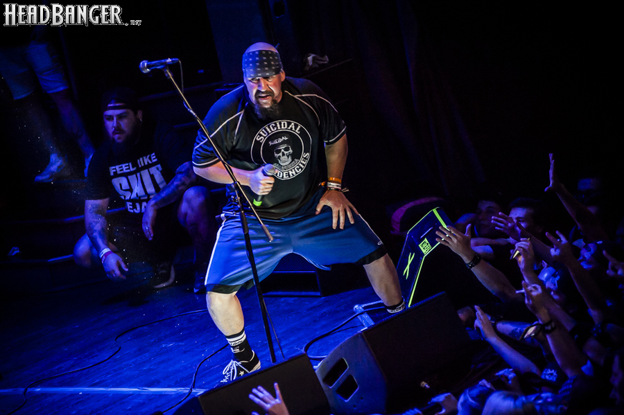 И вот минули эти 40 минут, и зазвучал струнчатый перебор, в котором несложно было узнать вступление к "You Can’t Bring Me Down". На этом фоне к микрофону вышел чернокожий не то техник, не то менеджер, в фирменной кепке с задранным козырьком, снизу которого вышито лого Suicidal Tendencies. На фоне дюжих молодцев-музыкантов выглядел он весьма субтильно. Однако, не в пример скромной своей комплекции, сей мужчина истошно представил главных героев вечера в лучших традициях 80-х, а тем как раз настало время вступить во всю мощь. И едва грянула боевая часть "You Can’t Bring Me Down", как закрутилось два сёкл-пита. Один на танцполе, и ещё один – на сцене. И крутились во втором, в отличие от «нижнего», не толкая друг друга и бодро перемещаясь в хаотическом хороводе, сами музыканты. Стоит отдать им должное: они продолжали это делать на протяжении всего концерта. За исключением пары моментов, о которых будет сказано чуть позже.