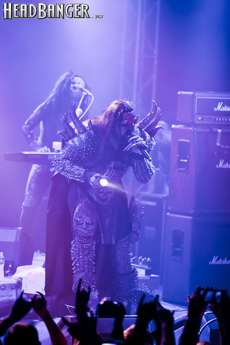Поздняя явка позволила мне не томиться в ожидании – буквально через 10 минут из порталов зазвучала «киссовская» “God Of Thunder”, а затем Lordi начали концерт композицией “Nailed By The Hammer Of Frankenstein” со своего последнего альбома. Алкогольно-дурашливая тематика и высокий темп этой незатейливой песни тут же растормошили заждавшуюся финский маскарад публику.