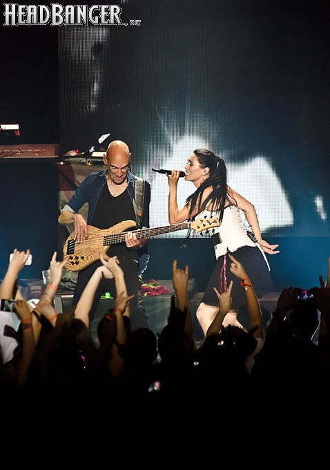 На протяжении всего вечера прекрасную фронтледи буквально осыпали цветами и подарками. После каждой композиции Шарон собирала из первых рядов не меньше 5-6 букетов, портретов и мягких игрушек. Такое внимание не могло не тронуть вокалистку, и каждый презент был отмечен ее искренним умилением. Апогеем стала огромная охапка ярко-красных роз, который солидного вида поклонник передал на сцену из вип-партера. Путь букета по рукам людей, стоящих в фан-зоне, занял целую песню “The Heart of Everything”, и завершился в руках Шарон как раз к ее окончанию. Изумленная певица с трудом смогла удержать цветы - их стебли были одного с ней роста. Думаю, лепестками с этого и других букетов вокалистка могла наполнять ванну до самого конца российского тура. Вот уж точно “Covered By Roses”.
