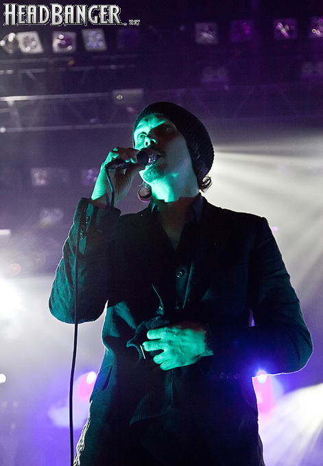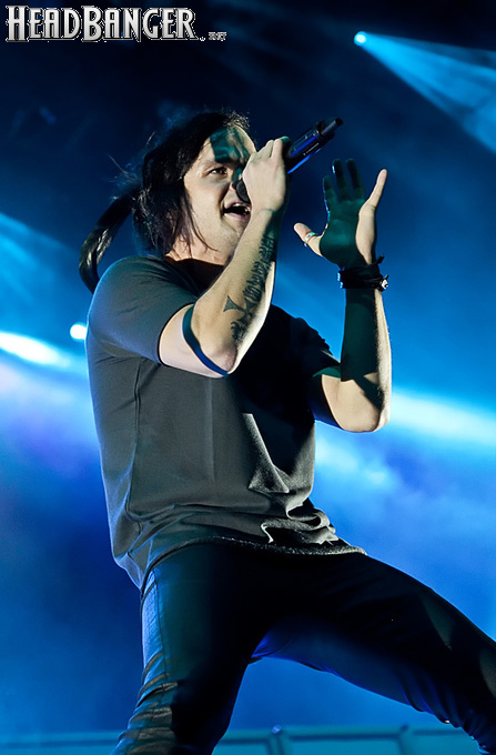 Появление на сцене H.I.M. сопровождалось настоящим шквалом женских голосов. Ну а когда группа открыла выступление динамичной “Buried Alive by Love”, восторженные крики лишь усилились. Однако с технической точки зрения все было не так празднично. Все то время, что фотожурналисты находились за работой, сцена была залита лишь тусклыми темно-фиолетовым красками, при этом стоило снимающим зачехлить камеры, как прожекторы озарили музыкантов ярким светом. Зачем это было сделано, сказать наверняка сложно. Не обошлось и без претензий к звуку. В течение первых нескольких композиций гитар и клавишных не было слышно почти совсем, и лишь по вокалу Вилле можно было догадаться, какой трек группа играет сейчас. К середине шоу звук более-менее выправился, дотянув до «четверочки», но голос фронтмена все же слишком доминировал над остальными инструментами. Несложно догадаться, что фанатки были лишь рады этому факту, но все-таки музыку послушать тоже хотелось.