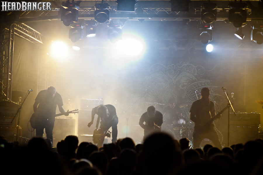 Заняв свои места на сцене под звуки интро “Siderian”, The Ocean плавно продолжили его эпической десятиминутной композицией “Rhyacian: Untimely Meditations”, которая начинается с медленной акустической части, взрывается эмоциями на припеве и затем развивается в совершенно непредсказуемом направлении, что, в целом можно сказать и о музыке группы вообще. Она очень интересная и завлекающая: вначале ты заслушиваешься красивыми струнными и акустической гитарой, затем вступает вокалист, который немного накаляет обстановку, ну а затем в дело идут жирные и качающие риффы, перемежающиеся со скримом, и уж тогда слушатель начинает (в хорошем смысле) сходить с ума, не в силах сопротивляться драйву и мощи музыки.
