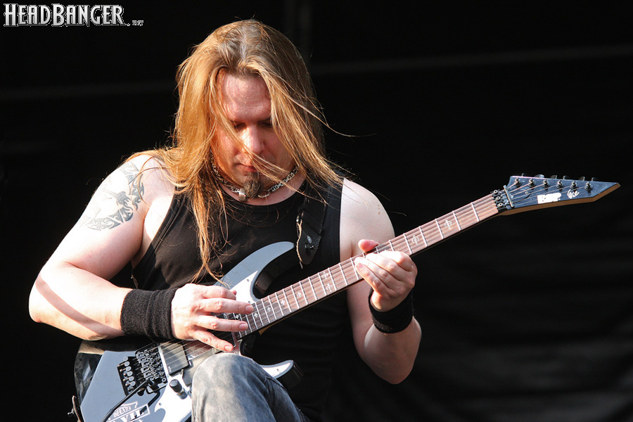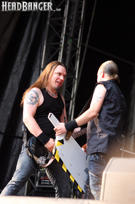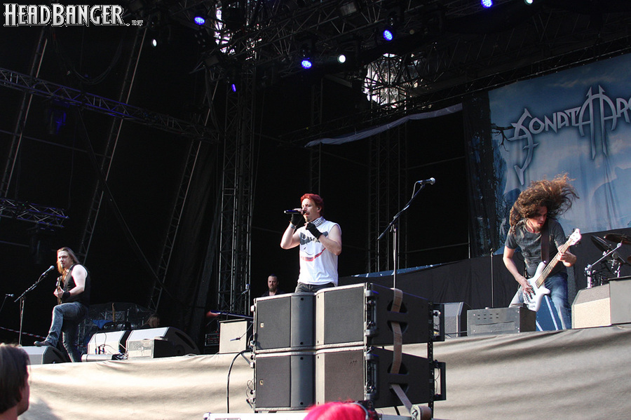 Стрелки часов перевалили за пять вечера, но жара и не думала спадать. Более того, к ней прибавилась духота, которая обычно бывает в преддверии проливного дождя. Все это заставило нас расстаться с мыслью посмотреть выступление Арконы, которую мы не видели живьем с 2006 года. Впрочем, это с успехом получилось в Москве два месяца спустя, так что особенно расстраиваться по этому поводу мы не стали. Поначалу у нас были сомнения и в необходимости торопиться на Sonata Arctica – я очень люблю их раннее творчество, да и два последних альбома доставили мне немало приятных минут, но после позапрошлогоднего выступления на “Sweden Rock”, где пятерка не особо подвижных музыкантов просто потерялась на огромной сцене, у меня не осталось сомнений в том, что слушать этих финнов лучше дома на дисках. Однако мы все-таки решили дать группе еще один шанс. И, как оказалось, не прогадали.