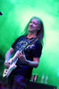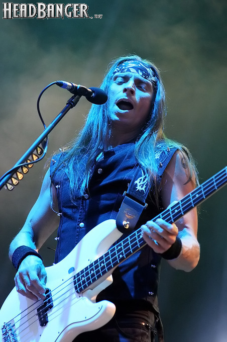 На Кая Хансена и его Gamma Ray я, напротив, возлагал большие надежды – очень хотелось, чтобы довольно-таки проходное выступление группы в Москве в апреле прошлого года оказалось досадной случайностью, а не истинным показателем нынешнего положения дел в группе. Мой интерес, как оказалось, разделяло немало народа. Хотя правильнее будет сказать «очень много народа» - к началу сета немцев даже дальние подступы к сцене были заполнены плотной толпой. И эта толпа все 75 минут принимала музыкантов как героев, с удовольствием подпевая хором знакомые припевы и терпеливо пережидая затяжные импровизации в “I Want Out” и “Somewhere Out In Space”. На руку группе играл и прекрасный звук, который просто не сравнить с московским. А вот скудный свет, напротив, практически не отличался – все то же преобладание синего в гамме. Хотя я в этот раз что-то слишком осторожно выбираю выражения, а нужно сказать прямо: почти никаких цветов, кроме бледно-синего, в освещении использовано не было.