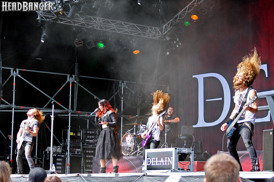 Помнится, в позапрошлом году интересные музыкальные события начинались для нас в районе двух часов дня, а до этого можно было шататься по музыкальным магазинам, рынкам и просто наслаждаться жизнью. В этот же раз приходилось стабильно прибегать в фестивальную зону к полудню. Именно на это время в четверг поставили голландских симфо-готик-металлистов Delain, которых я дважды пропустил в России, и было бы непростительно продинамить их еще и здесь. Музыка Delain, по большому счету, ничего необычного собой не представляет – это очередное переложение на свой лад удачных идей Within Temptation, да и трудно было бы ожидать другого от группы, лидером которой является брат гитариста «Темптейшнов» Роберта Вестерхольта – клавишник Мартейн. С учетом того, что подобного рода команд развелось сейчас просто огромное количество, выделиться на их фоне можно только одним способом – сочинять по-настоящему яркие и запоминающиеся песни. И Delain прекрасно справляются с этой задачей – каждый из четырех их альбомов содержит свою порцию хитов, которым со временем уготовано место в сокровищнице жанра. Ну а пока их место - в сет-листах туров, из которых Delain в последние несколько лет буквально не вылезают. Это вызывало у меня некоторые опасения – все мы знаем, до какого состояния довели себя непрекращающимися гастролями Children Of Bodom. Однако голландцы – по крайней мере, пока – с туровыми трудностями справляются блестяще: им удалось не просто адекватно воспроизвести на сцене студийные версии своих лучших песен, но и усилить их мощнейшей энергетикой. Было совершенно очевидно, что музыканты откровенно получают кайф от игры – они буквально летали по сцене, трясли хаерами и взаимодействовали с публикой. Особенно усердствовала миниатюрная гитаристка Мерель Бехтолд и столь же юный барабанщик Рубен Израэль – дня них, насколько я понял, это первые по-настоящему серьезные гастроли, и они получают от них все удовольствие, какое могут. Но не отставали и ветераны, среди которых главное внимание было приковано к вокалистке Шарлоте Весселс. Опять-таки, у нее не самый оригинальный голос всех времен и народов, но она прекрасно им владеет – в какой-то момент очаровательная брюнетка даже резко перешла с ангельского пения на вполне себе сочный гроул! И она, как и все остальные, постоянно находится в движении, общается со зрителями, так что, несмотря на ранний по фестивальным меркам час, собравшуюся у “Sweden Stage” толпу Delain завели без особых проблем. Просто прекрасное начало дня!