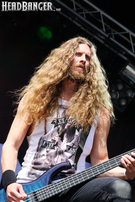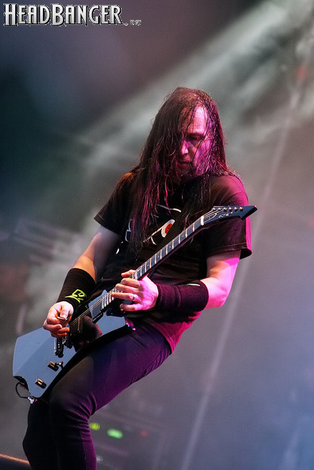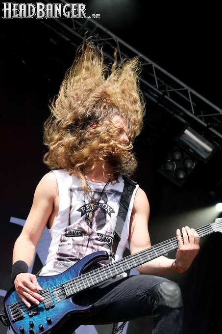 На любом фестивале, где количество сцен больше двух, рано или поздно настает момент, когда несколько интересных событий происходит одновременно. У нас он настал в 20.45, когда на двух соседних сценах начались выступления Hammerfall и Exodus. Hammerfall я люблю больше, но уже видел порядка пяти раз, Exodus – чуть меньше, но еще не видел ни разу, поэтому сделать выбор было по-настоящему трудно, и было решено посмотреть по половинке сета каждой из групп. Ближе было добираться до Hammerfall, что чуть не оказалось ошибкой – через пару песен я понял, что «втянулся», и уйти отсюда, не дослушав их сет до конца, будет не так-то просто. Hammerfall – прекрасная концертная группа, причем во всей красе она раскрывается именно при большом скоплении публики. На “Sweden Rock” у них как раз была такая возможность – они выступали на родной земле практически перед хэдлайнерами и показали все, на что они способны. К звуку и свету не было ни одной претензии, хиты разных лет лились, как из рога изобилия, а те из них, на которые в программе не хватило место, оказались объединены в инструментальное попурри “400 Meter Medley”. Если в прошлом году на московском «Ария-Фесте» в выступлении чувствовалась некоторая нервозность, вызванная тем, что Hammerfall впервые вышли на сцену с новым барабанщиком, то сейчас все было отточено практически до идеала. Лично мне не хватило только любимейшей баллады “Glory To The Brave”, но такие бессмертные боевики как “Threshold”, “Last Man Standing” и “Heeding The Call” практически скомпенсировали это досадное упущение.