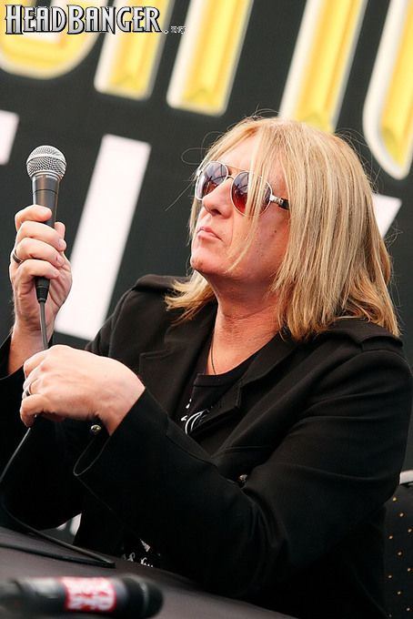 Следующий час после Battle Beast мы планировали посвятить отдыху, но именно на это время организаторы поставили пресс-конференцию Def Leppard, и отдых (по крайней мере, можно было посидеть на стуле) нам пришлось совмещать с получением новой информации. В этом году фестиваль изменил свой подход к пресс-конференциям: если раньше их было по несколько штук ежедневно, то сейчас всего три за все четыре дня. Рациональное зерно в этом есть – значительная часть «прессух» раньше собирала по 10-15 журналистов, которые вместо задавания вопросов предпочитали молчать и щелкать затвором фотоаппарата, но с другой стороны, на фестивале выступает немало артистов, эксклюзивное общение с которыми изданию нашего уровня не светит, а получить их комментарии по каким-нибудь любопытным темам все равно хочется, и такой возможности в этом году немного не хватало. Def Leppard относятся как раз к такой категории групп, пусть даже информационных поводов они в последнее время предоставляют не так много. Видимо, исходя из этого, группа решила, что всем составом присутствовать на пресс-конференции не обязательно, и послала отдуваться вокалиста Джо Эллиотта и гитариста Фила Коллена. Эллиотт живо напомнил нам Биффа Байфорда из Saxon – горделивая осанка и четкое понимание своей значимости для общества вызывали желание вложить в его уста знаменитую фразу: «Спасибо моим родителям за то, что дали этому миру меня». Однако на вопросы он отвечал подробно и по делу, охотно и смешно шутил, так что «прессуха» Def Leppard вошла в число самых толковых за три моих года на фестивале. Впрочем, дата выхода нового альбома, которого мы ждем с 2008 года, в очередной раз не прозвучала, а на идею отыграть в Европе такой же ангажемент, какой группа регулярно получает в Лас-Вегасе, был дан ответ: «Сначала постройте в Европе такие же казино».