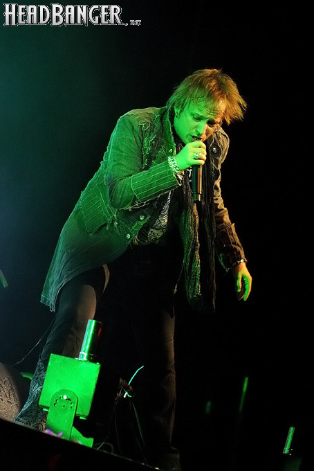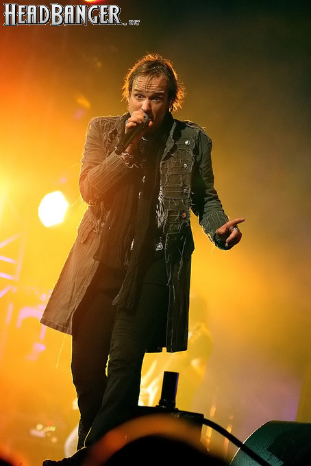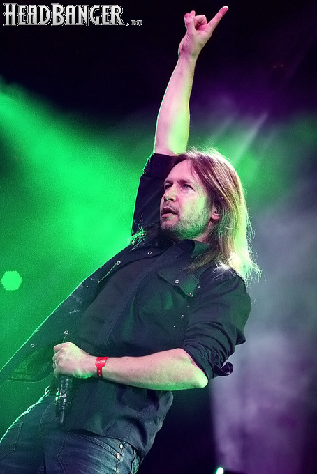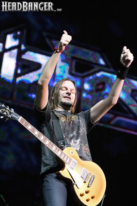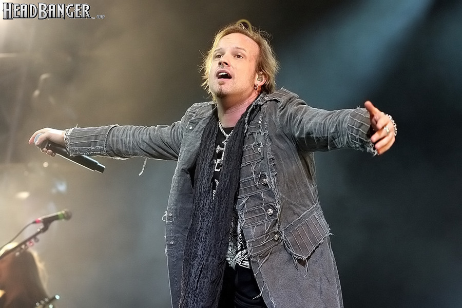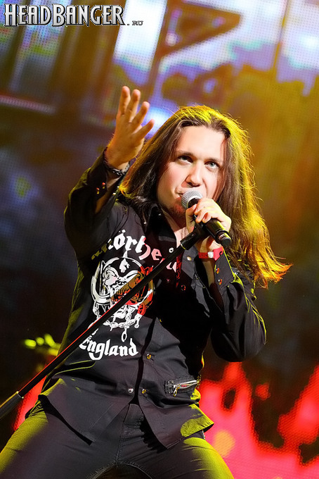 Самой ожидаемой группой первого дня «Ария-Феста» для меня были Edguy. К творчеству гениального коротышки Тобиаса Заммета я питаю огромную любовь вот уже почти 20 лет, а приезжает он к нам далеко не так часто, как многие другие (всего-то четыре раза с 2002 года, если не считать еще двух концертов с Avantasia). И пусть два последних альбома Edguy, при всех их достоинствах, наводят на грустные мысли о том, что все лучшие песни у Тоби уже позади, как концертный вокалист Заммет в последние годы колоссально прогрессирует, а в перспективах услышать много старого материала сомневаться не приходилось. Но для начала прозвучал все-таки новый материал – программа открывается синглом “Love Tyger” с последнего на сегодняшний день альбома “Space Police – Defenders Of The Crown”, и если в студийном варианте эта песня звучит несколько лекговесно и, скажем так, не особо обременена серьезным посылом, то живьем для раскачки публики она работает безукоризненно. У Edguy были в свое время серьезные песни и даже серьезные альбомы, пусть и напрочь не понятые публикой, но их концерты - это цирк-шапито в исполнении одного актера, и для них такая непосредственность и легкий стеб - как раз то, что надо. Впрочем, уже второй трек “Space Police” показывает, что сбрасывать Edguy с хэви-металлического счета тоже не стоит: мощный и хитовый, он напоминает столь любимые мной времена альбомов “Rocket Ride” (2006) и “Tinnitus Sanctus” (2008). Ну а дальше идет флэшбэк прямиком в эти самые времена – «программный» трек “Out Of Vogue” с “Rocket Ride”, не исполнявшийся в туре в поддержку того альбома и неожиданно вытащенный из запасников сейчас.