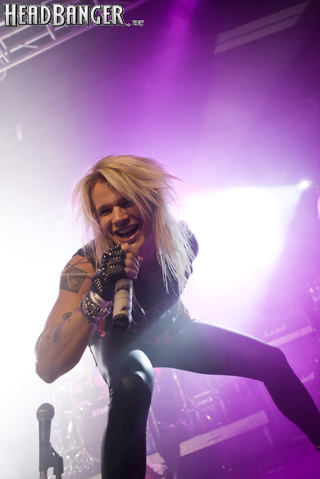 Где-то к двадцати минутам десятого зал был заполнен вполне себе прилично, хотя свободные места и присутствовали, и на сцене появилась светящаяся во всех смыслах этого слова четверка героев торжества. По высокочастотным крикам из зала можно было легко определить, что количество девушек сегодня значительно превышает количество мужчин. Оно, впрочем, и понятно – глэм-рокеры традиционно уделяют достаточно много внимания своему внешнему виду, и участники Reckless Love в этом смысле не являются исключением, возьмите хоть татуированного и голого по пояс ударника Хейки Ахоннена, хоть смазливого светловолосого фронтмена Олли Хермана, который выскочил на сцену в белом блестящем пиджаке, тёмных очках в розовой оправе, кожаных лосинах и цветастых кроссовках. Такой прикид показался бы пошлым и чересчур экстравагантым на ком угодно, кроме участника глэм-рок команды. Ну а когда отгремел первый номер программы – хит “Night On Fire”, в котором ребята пообещали взорвать этот вечер, Олли под восторженные крики женской половины аудитории сорвал с себя пиджак и очки, оставшись в баскетбольной майке. Поприветствовав собравшихся и вдоволь поиграв своими мускулами (честное слово, если покрасить ему волосы в черный цвет, то можно хоть в Manowar парня отправлять), Олли объявил следующую песню - “So Happy I Could Die”, и для многих собравшихся это название было бесконечно правдиво – мало того, что группу явно очень любят, так и она отвечает на фанатскую любовь такой искренней взаимностью, что многие более опытные коллеги финнов по цеху могут только позавидовать.