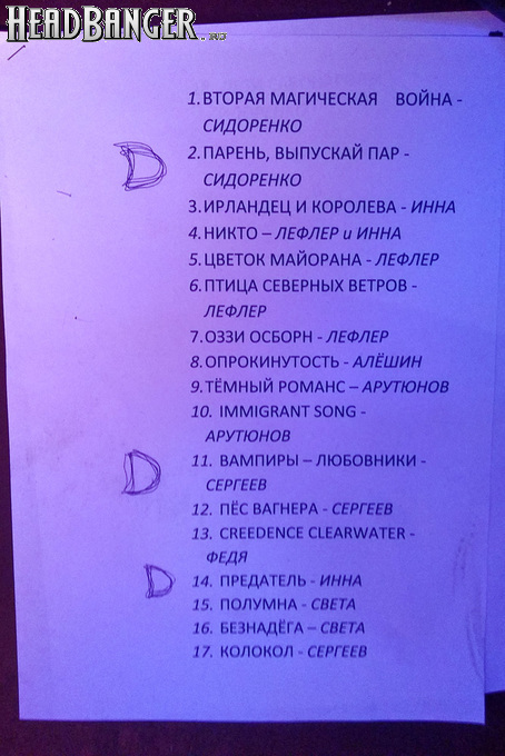 Тем временем концерт приближался к финалу, и хотя в середине сет-листа, который мы усмотрели на краю сцены (см. фото), значились еще две композиции, они так и не прозвучали - как мы потом выяснили, по причине опоздания планировавшегося для них вокалиста. Последней же в нем стояли “Дети Савонаролы” - одна из самых драматических композиций на одноименном альбоме, где голос Дмитрия Борисенкова до сих пор вызывает у меня мурашки. Однако Михаил Сидоренко, как выяснилось, поет ее ничуть не менее величественно и зловеще, а детский хор удачно заменили Светлана Тиш и Инна Евтушенко. Вокальное трио в центре переднего края сцены, скандирующее: “Марш-марш, армия детей Савонаролы!”, и подпевающий им хор зрителей - еще один незабываемый момент вечера. Кто-то наверняка скажет, что программу стоило бы закончить чем-то более позитивным, ведь подходящих для этого песен у Margenta хватает (навскидку могу предложить “Дети рок-н-ролла” или “Увеличивай карму добра”), однако “Дети…” слишком долго ждали своего шанса на живое воплощение, чтобы не воспользоваться этим шансом сейчас. Такие песни просто обязаны звучать вживую, тем более что за прошедшие с момента появления альбома 16 лет он стал лишь еще актуальнее.