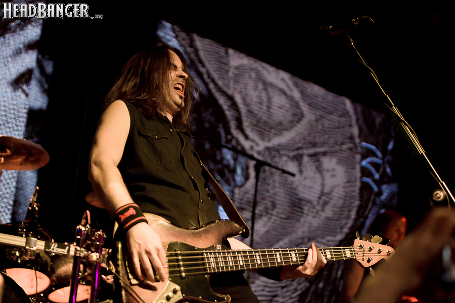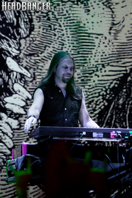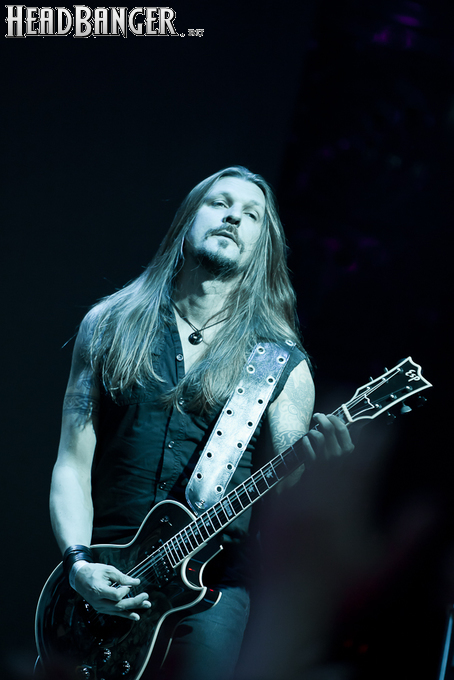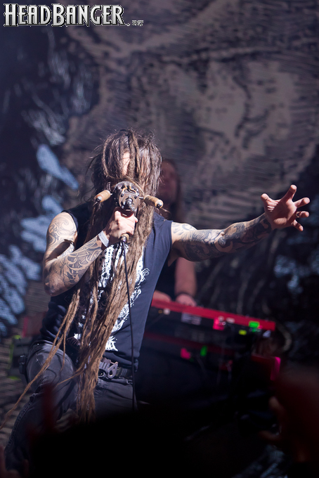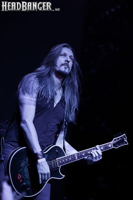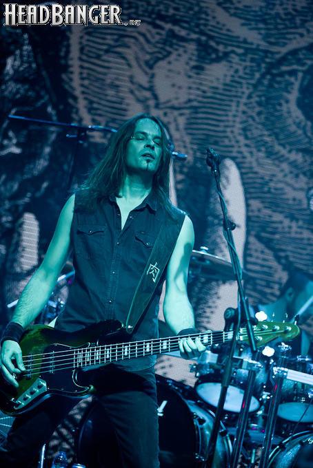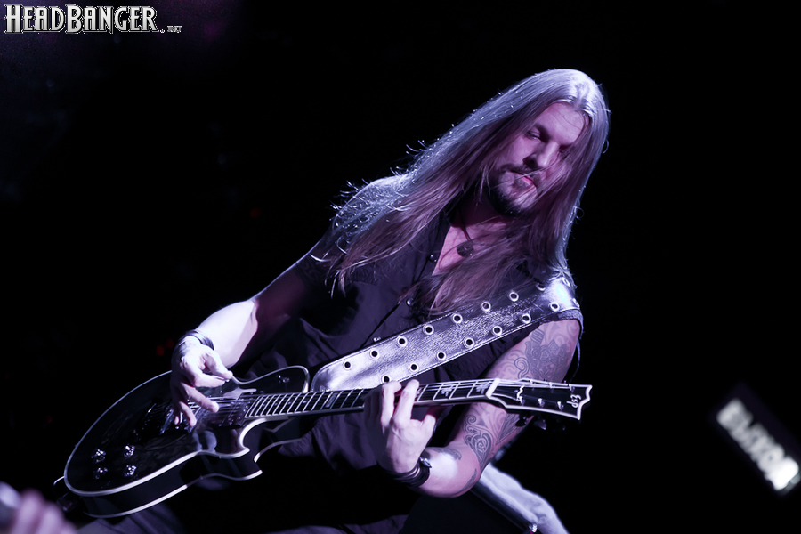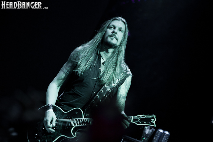 Буйство вокала продолжилось в “Weaving The Incantation”, одной из любимейших мной вещей с довольно-таки спорного альбома “Silent Waters”. По части экспрессии это был один из самых сильных номеров вечера. Затем курс был взят на еще один легендарный и, пожалуй, самый мой любимый альбом «старого» Amorphis – “Elegy”, откуда подряд были сыграны забойная “On Rich And Poor”, которой не было в предыдущих сет-листах этого тура, что стало для меня крайне приятным сюрпризом; а потом и вовсе отдающую чем-то из 70-х “Weeper On A Shore”, которую группа не исполняла вживую чуть ли не с 1997 года. Далее последовали брутальная “Majestic Beast”, драйвовая, но при этом лиричная “Mermaid”, лав-металлическая “Silent Waters” и – куда же без неё – очередная песня, без которой, кажется, не обходится ни одно выступление группы – “My Kantele”. Начавшись как акустическая версия, она продолжилась пространным и впечатляющим джемом всех участников группы и, в конце концов, вылилась во всем знакомую и любимую качающую вещь с гроулом, фолковым припевом и замечательной гитарно-клавишной работой, ставшей практически кульминацией вечера.