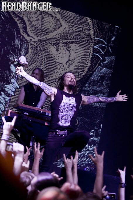 На сцене в это время выступала Группа с большой буквы. Томи Йоутсен, обладатель одной из самых экстравагантных причёсок на сегодняшней метал-сцене, чувственно и эмоционально пел в свой традиционный монструозный микрофон, чем-то похожий на фен, и периодически сотрясал воздух диким хэдбенгингом, постоянно рискуя задеть кого-нибудь из соседей по сцене. Эса Холопайнен, один из основателей и старожилов группы, казался несколько отстранённым от происходящего в зале и сосредоточенным исключительно на филигранном выписывании замысловатых и красивых партий лид-гитары, только изредка улыбаясь в зал и потрясывая волосами лишь в кульминационные моменты. Ритм-гитарист Томи Койвусаари вёл себя несколько активнее, но в целом потрясающим контактом с залом похвастаться тоже не мог. Это же касается и остальных участников группы – обычно очень активного басиста Никласа Этелявуори, клавишника Сантери Каллио и, чуть в меньшей степени, ударника Яна Рехбергера. Было слегка заметно, что ребята приехали в основном именно «отыграть». Но даже несмотря на это, великолепная музыка в полной мере говорила за музыкантов, и даже некая их «аморфность» (простите за каламбур) практически не повлияла на потрясающий заряд разного рода положительных эмоций, любезно преподнесённый финнами пришедшим в клуб любителям группы. Поэтому первая часть концерта из шести песен с альбомов, на которых поёт Томи, пролетела на одном дыхании. Я даже не успел понять, что, собственно, произошло, как группа уже покинула сцену, на экране появилась очередная картина суровой финской природы, и заиграло интро к легендарному альбому “Tales From The Thousand Lakes”, который, кстати, празднует в этом году своё двадцатилетие. Затем последовала одна из визитных карточек группы – “Black Winter Day”, в которой Томи наконец-то в полной мере показал своё мастерское владение утробным гроулом, способным, кажется, сносить стены. Вообще, то, как Йоутсен сочетает чистый и экстремальный вокалы, достойно отдельных слов похвалы. Постоянные срывы с мягких и нежных моментов в дикий рёв звучат в его исполнении очень мощно как на записи, так и, в особенности, вживую. Потрясающий вокалист. Хотелось бы также отметить клавишное соло Сантери Каллио, однако, к сожалению, слышно его почти не было из-за очередных навалившихся проблем со звуком. Все остальные инструменты во время “Black Winter Day”, однако, звучали абсолютно нормально. Да и все последующие клавишные соло Каллио звучали естественно, очень профессионально и душевно.