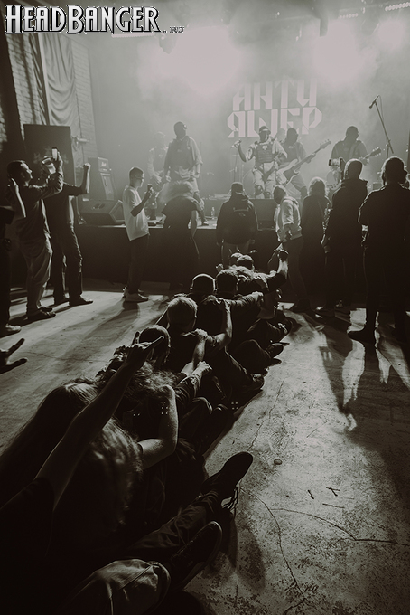 Мощно и энергично прозвучали «образовательные» треки, раскрывающие тайны, которые десятилетиями оставались покрытыми мраком: «Тунгусское пламя», «Битва за Байкал», «Дальняя Тьма», «Технослобода», «На страже Земли», трогательный «Сын далеких звезд», посвященный кыштымскому карлику, и «Энерголадья», которую зрители запросили на бис. «Гражданские из Петербурга» — так со сцены обращались к слушателям — приняли концептуальных Анти-Ящеров невероятно тепло, с первых минут начав трясти хаерами и активно слэмиться. На повторе «Энерголадьи» музыканты попросили изобразить лодку. Наплевав на чистоту своих брюк (и других предметов одежды), зрители оперативно уселись на пол и под счет со сцены «И раз, и два, и три, и четыре!» весело стали грести «сквозь туман».