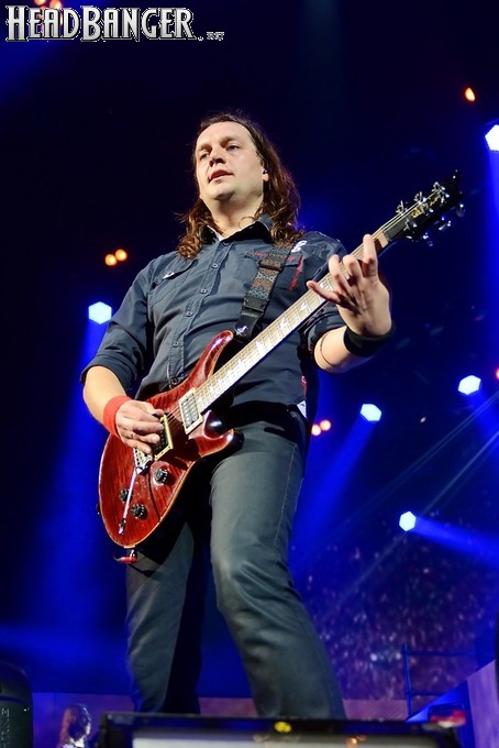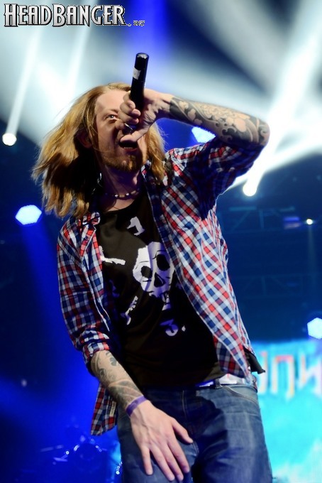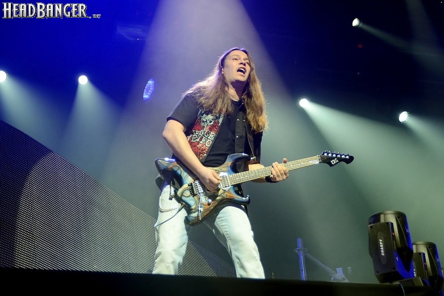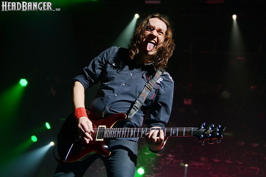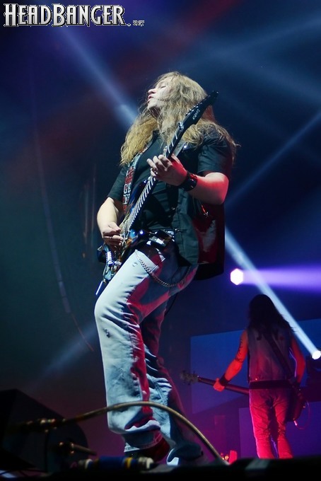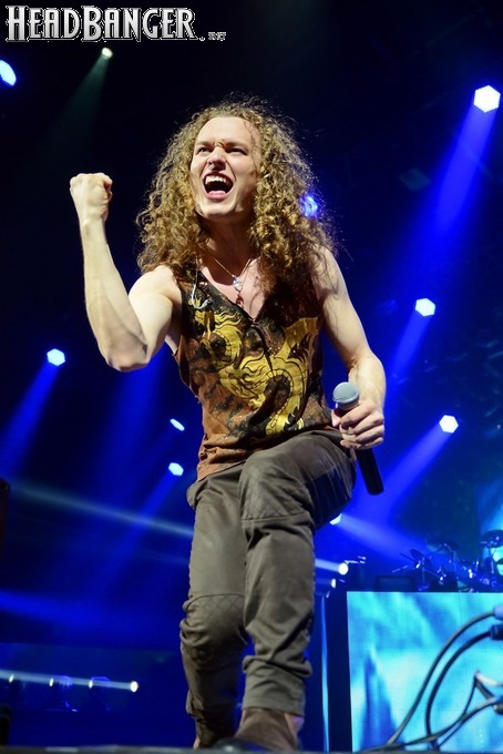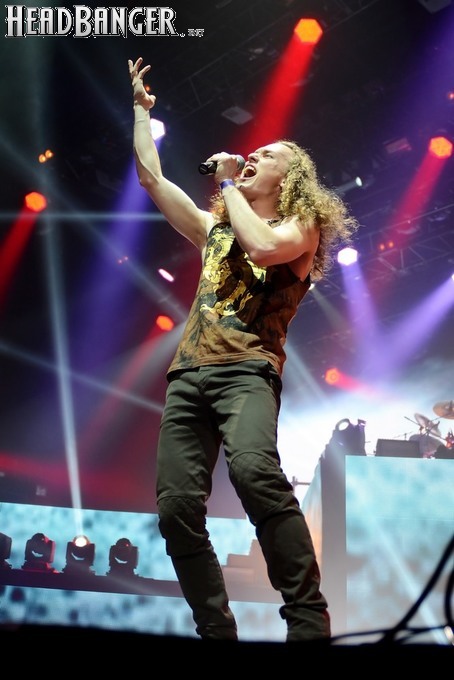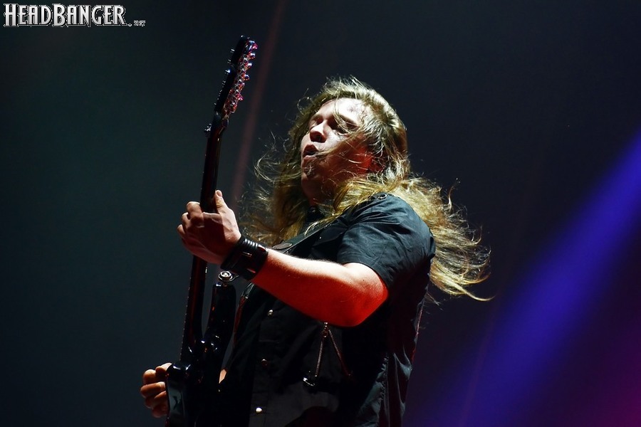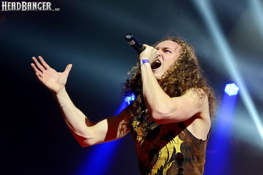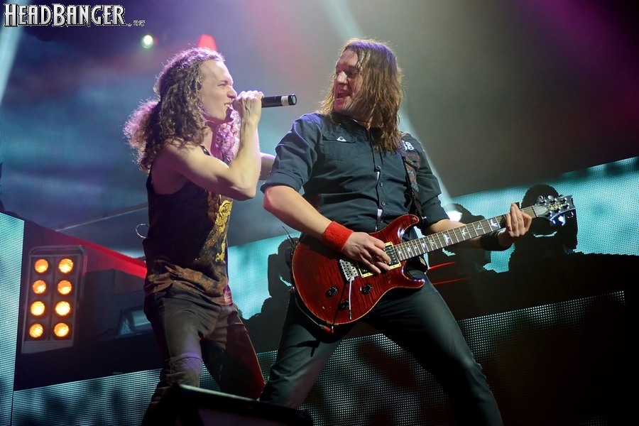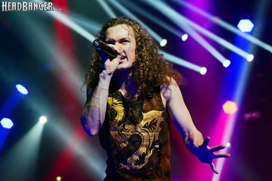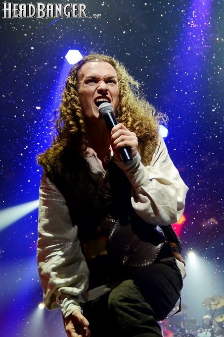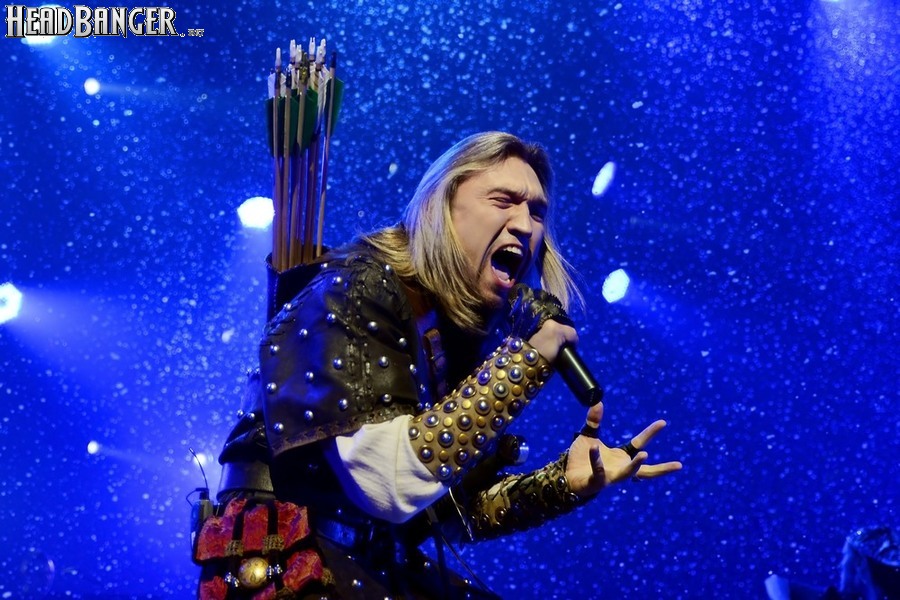 До начала концерта сцена была скрыта чёрным занавесом, чтобы никто не смог увидеть заранее ее убранство. Разумный ход, но, как показала практика, несколько излишний — накуренность в зале была такой, что за стеной дыма сцены всё равно не было видно, и даже без занавеса что-то разглядеть смогли бы только первые ряды. С поразительной пунктуальностью, в заявленные восемь часов вечера из колонок зазвучало интро. Спустя всего пару минут сцена засветилась бесчисленными софитами, а занавес упал, являя взгляду огромную трехуровневую конструкцию, позволявшую без проблем уместить всех участников действа. Барабанная и клавишная установки устроились на самом верху, в центре, там же обосновался басист Илья Мамонтов. Чуть ниже по бокам стояли гитаристы, а нижний уровень был полностью отдан вокалистам и многочисленной подтанцовке, изображающей пиршество в дворце Дезмонда. Жаль, конечно, что самого Дезмонда на этом празднике жизни не было (так, кто сказал — а под столом искали?), но жизнь продолжается, и эта история прекрасно развивается и без него. Благо Гилтиас, то есть Евгений Егоров, прекрасно справляется с ролью главного персонажа.