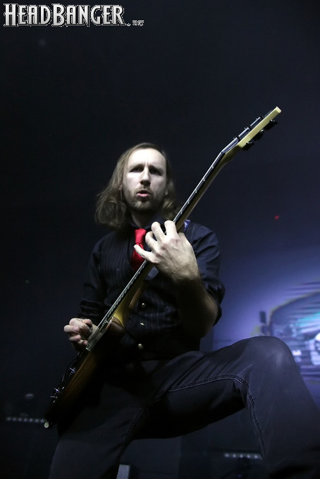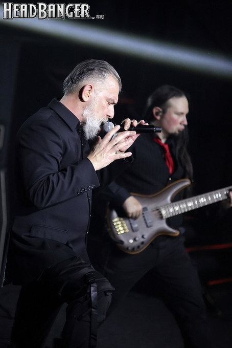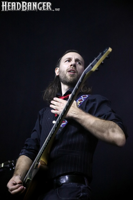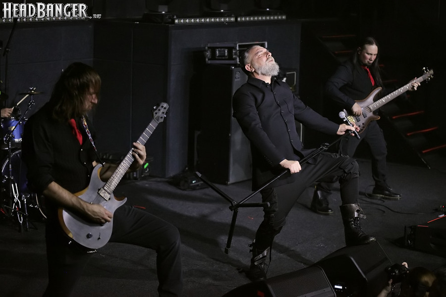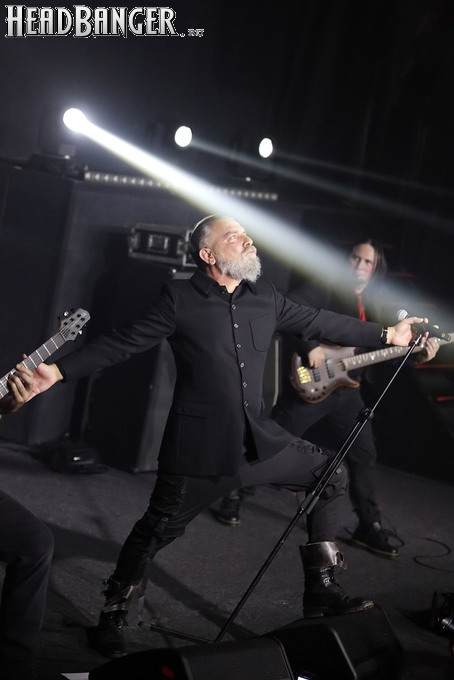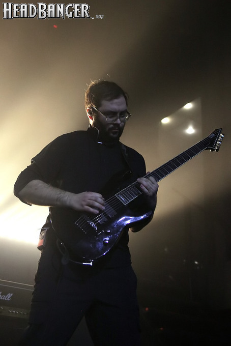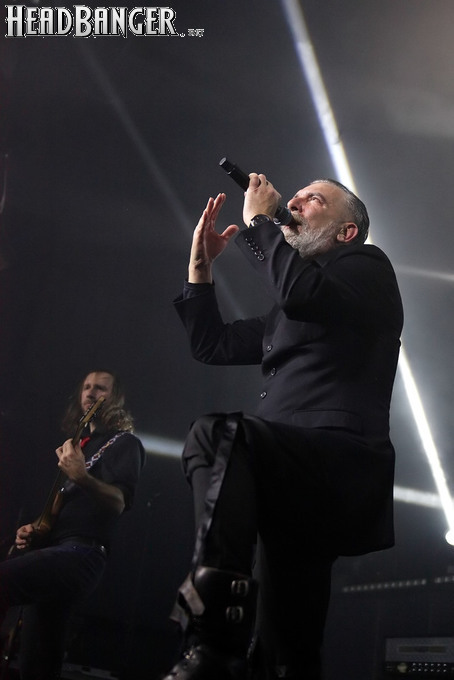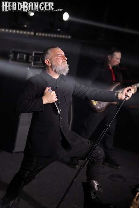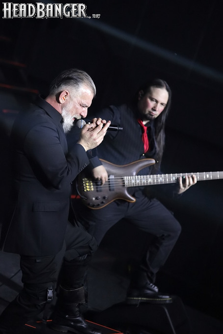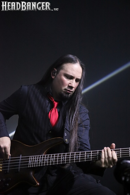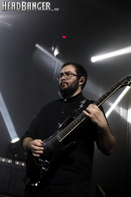 Хотя Dark Lunacy родом из страны, где принято ко многим вещам относиться легко и не “запариваться”, для описания многих аспектов деятельности группы на язык просится слово “строгий”. Они строго пунктуальны: хотя The Fall Of Creation вышли на сцену с 15-минутным опозданием, шоу хэдлайнеров началось ровно в девять вечера, как и было запланировано. У них строгий имидж: никаких футболок или шортов; все четверо предстают перед публикой в черных рубашках и пиджаках, а трое инструменталистов - с красными галстуками. Они предъявляют строгие требования к саунду: о хаотичности разгоревающей группы не осталось и следа, живое выступление Dark Lunacy максимально приближено к тому, как они звучат на студийных записях, пусть даже для этого приходится использовать записанные хоры, скрипку и др. И лишь со светом что-то пошло не по плану: он как включился в середине сета The Fall Of Creation, так и не отключался до самого конца вечера. Из-за этого видеоряд, который Dark Lunacy транслировали на заднике сцены - а это и клипы самой группы, и документальная хроника, и кадры из фильмов - ушел в тень, и чтобы его рассмотреть, приходилось целенаправленно вглядываться. Изначальная задумка музыкантов, насколько я могу судить, была несколько другой.