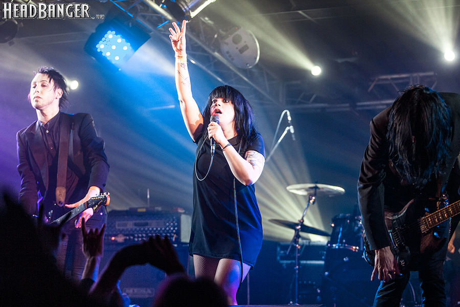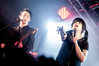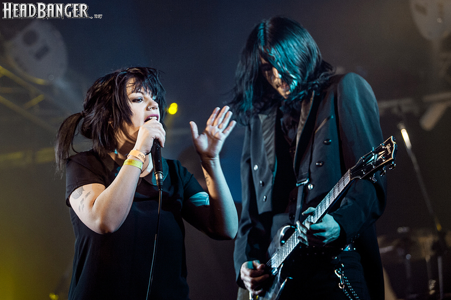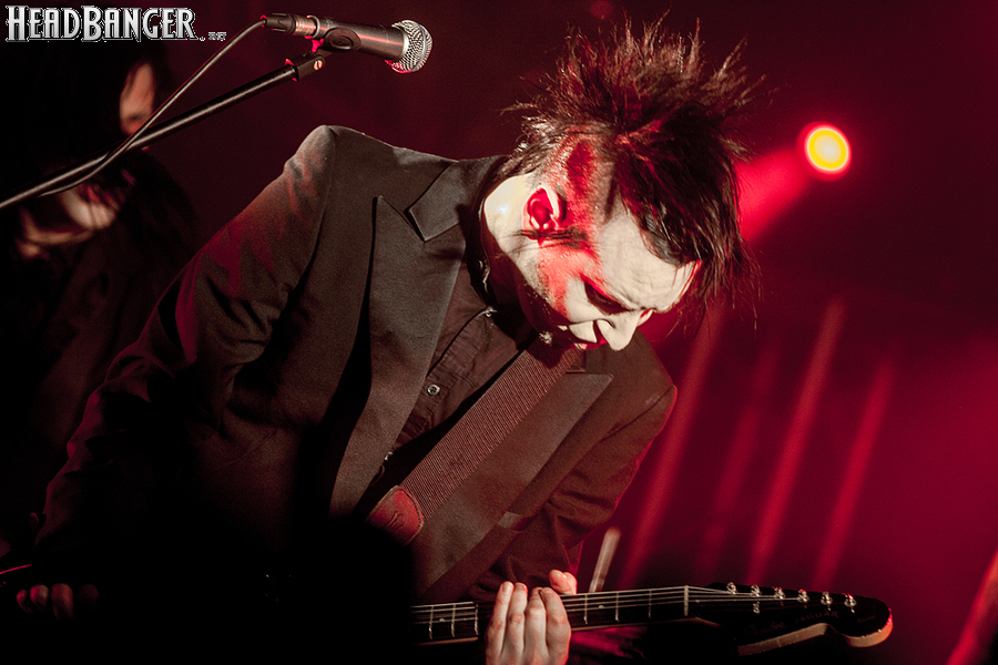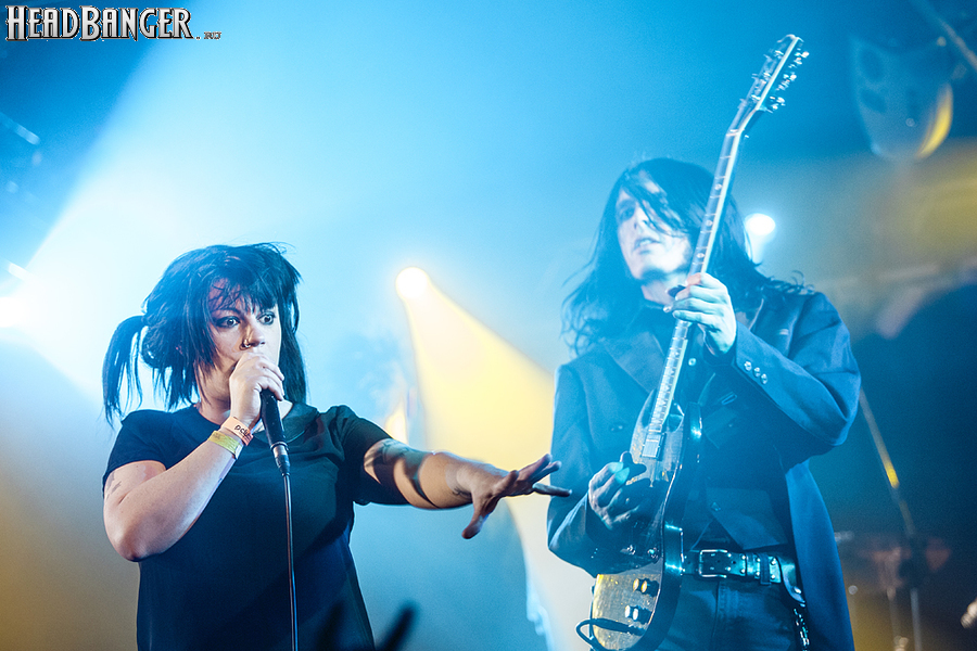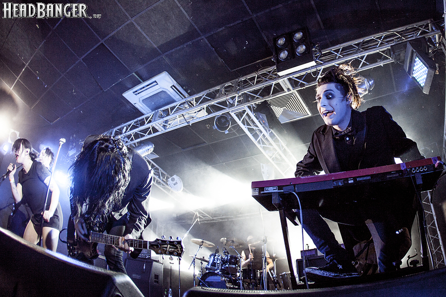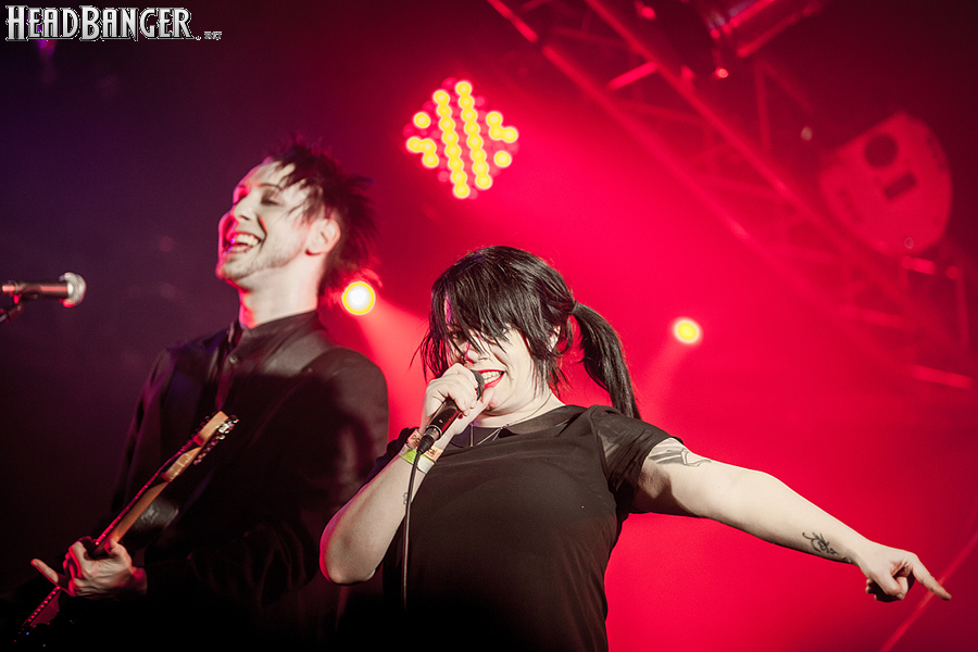 Концерт начинается с жестких грувовых риффов “Red Stars”, которые задают тон всему концерту. Сразу становится понятно: сегодня здесь будут играть рок. Мягкое студийное звучание, сочетающее в себе альтернативный рок, синти-поп, поп-индастриал, дарквейв, дрим-поп и хоррор-саундтреки в духе Джона Карпентера осталось на альбомах, живьем же канадцы играют заметно жестче. Гитары звучат громко и грязно, оттесняя электронику (доминирующую в студийных записях) на второй план – впрочем, чего еще ожидать от состава с двумя гитаристами? Впрочем, хуже от этого никому не становится: простые, но цепляющие риффы влияют на энергетику концерта самым лучшим образом. У The Birthday Massacre не так уж и много ню-металлических композиций, но этим вечером они сыграли почти все из них: помимо вышеупомянутой “Red Stars”, прозвучали и “Pins And Needles”, и “Down”, ну и, конечно, “In the Dark”, сыгранная на бис в качестве одного из главных хитов. Да и другие композиции несколько утяжелились, хотя в таких вещах, как “Shallow Grave” или “Video Kid” звучание все равно скорее танцевальное, чем «хэдбенгерское». Ну а вокал Чиби по-настоящему прекрасен. Он особенно впечатляет в моменты, когда она переходит с ангельского пения на зловещий шепот или рык – кажется, все это она проделывает, совершенно не напрягаясь.