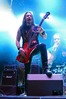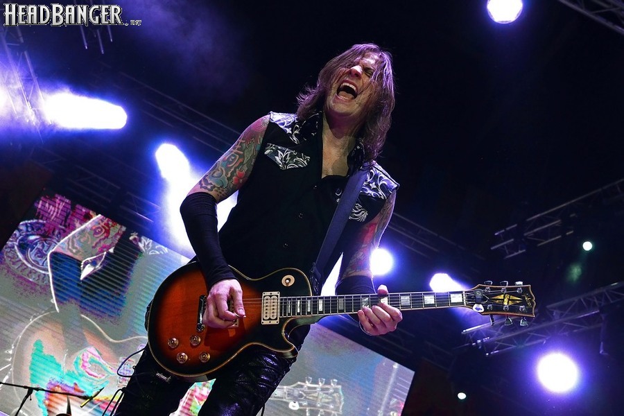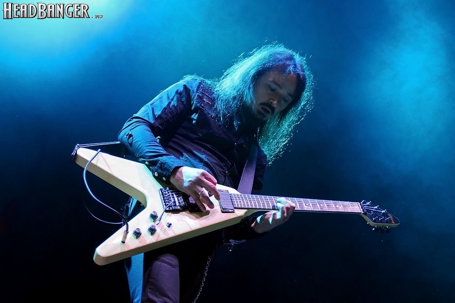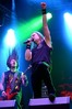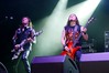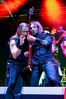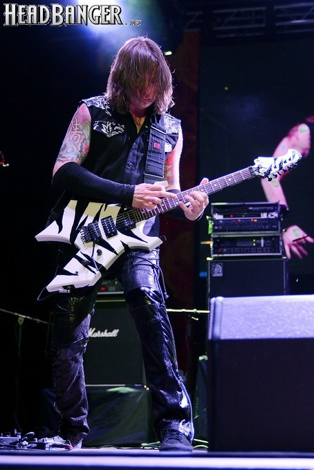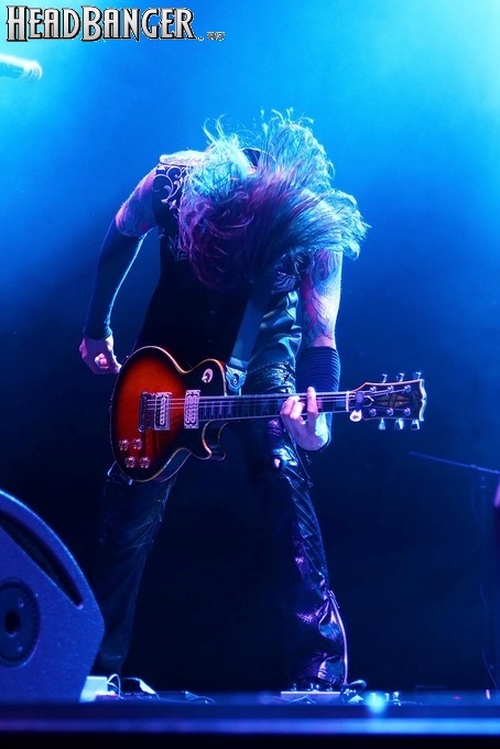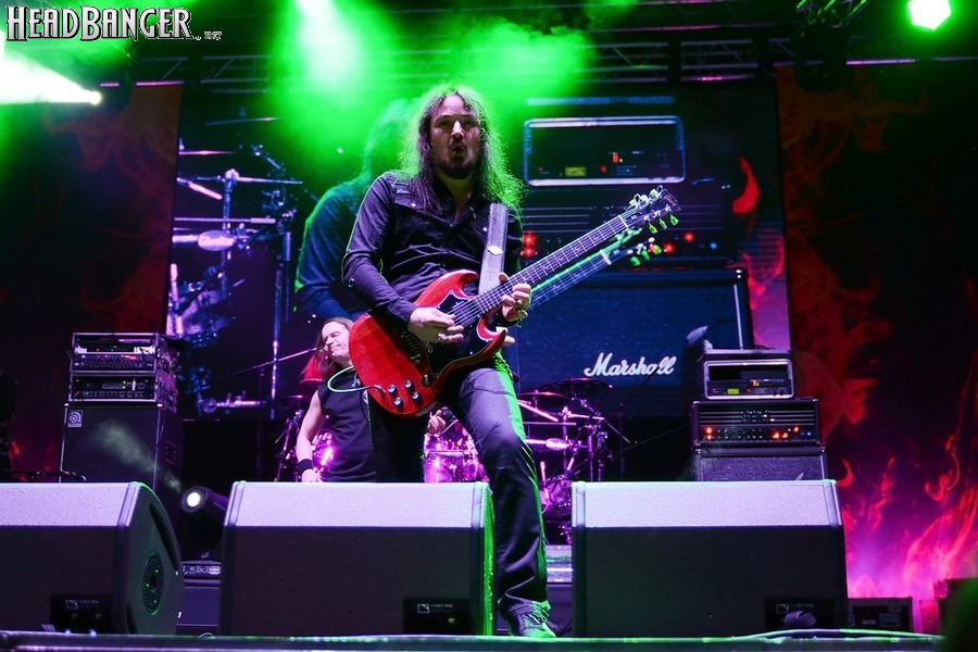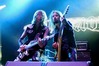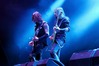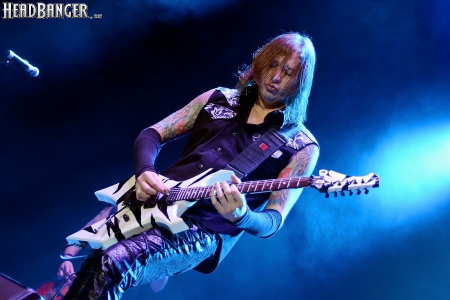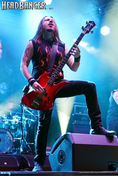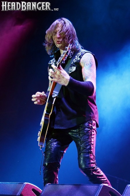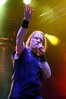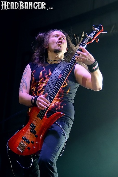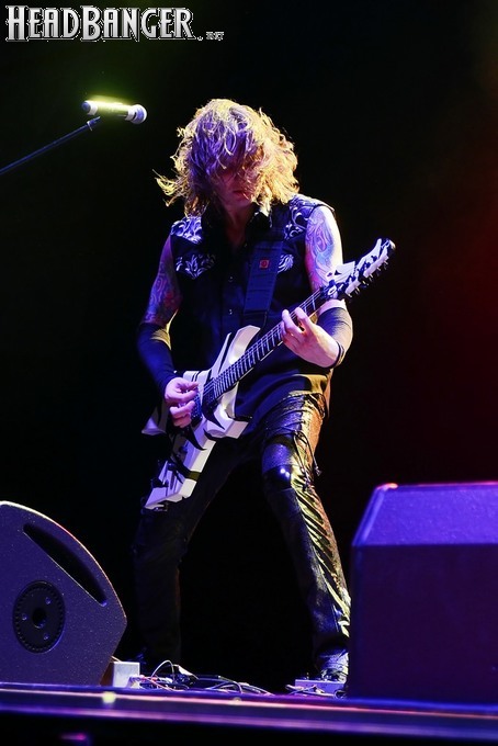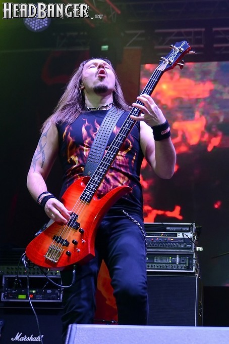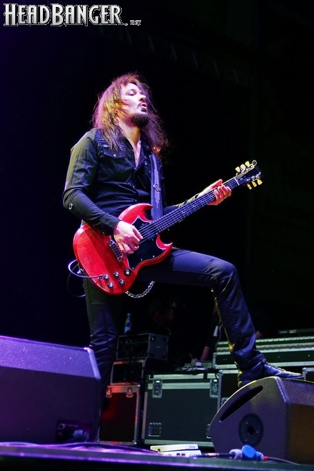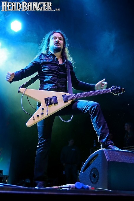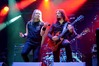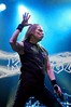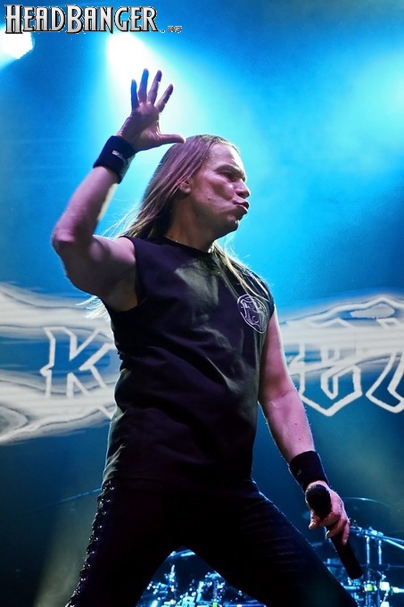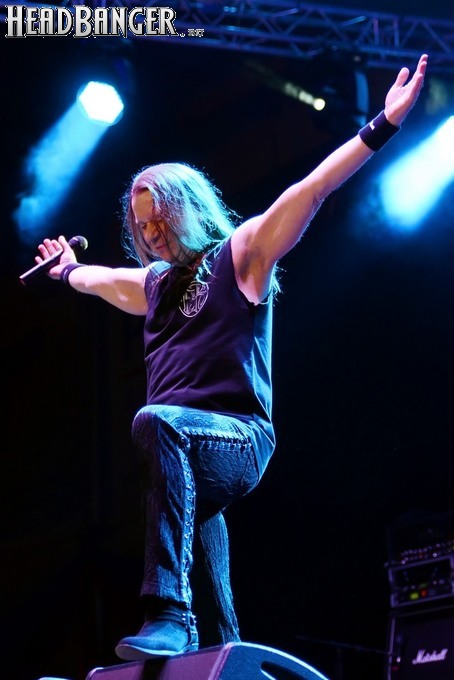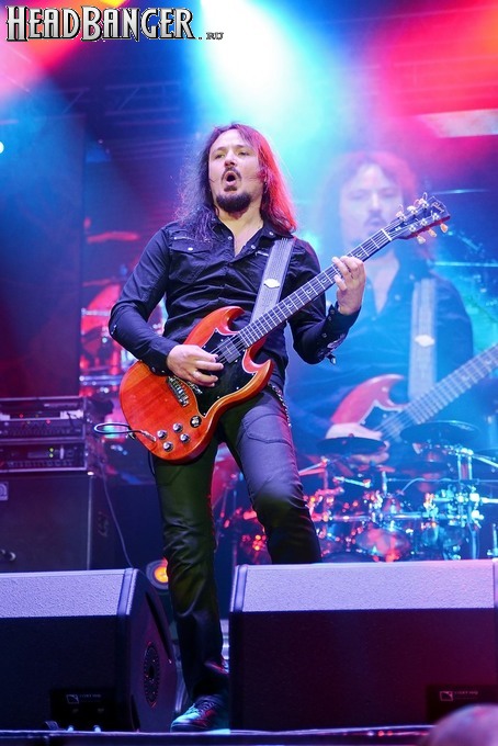 Сцена была смонтирована прямо на льду на специальном покрытии, поэтому многие зрители партера замерзли, но мы знали, что как только на сцену выйдет Маэстро, сразу станет очень жарко. И действительно, задержавшись минут на 20, музыканты открыли свою программу песней под говорящим названием «Власть Огня». Звук сразу резанул по ушам, и стало очевидно, что акустику зала при настройке явно не учли. При довольно-таки хорошем качестве саунда его громкость была просто ужасающей, так что стоять в первом ряду было действительно сложно, но желающих покинуть свои места не нашлось. Да и Валерий Александрович не подкачал. Волна эмоции зрителей и волна энергии, исходящей от музыкантов, сошлись, и началось нечто невообразимое. Под следующий трек «Еще Повоюем» отрывались все. С учетом количества зрителей - по разным источникам их было от 2,5 до 3 тысяч - это выглядело действительно впечатляюще. Хочу отметить и то, что музыканты выкладывались по полной, что для концерта в «уездном» городе действительно редкость. Светился и сам Кипелов: блистая улыбкой, он призывал всех петь вместе с ним знаменитый «Вавилон», и зрители с радостью откликались на призыв. «Чтоб я так жил!» - подытожил Валерий вокальные способности публики. И музыканты вдарили боевик «Дыханье Тьмы».