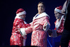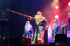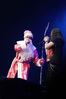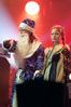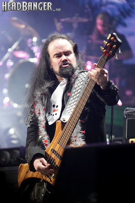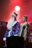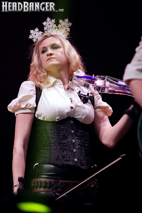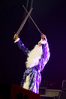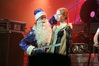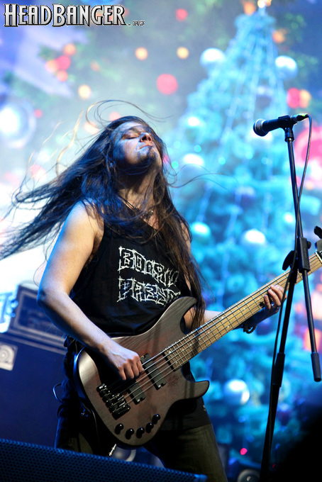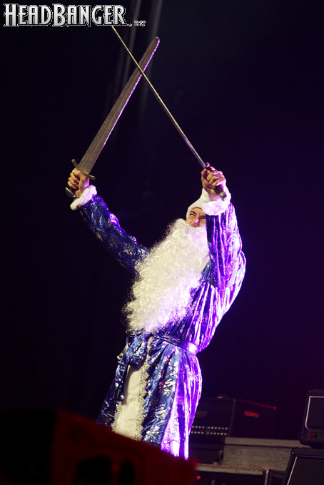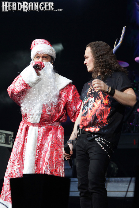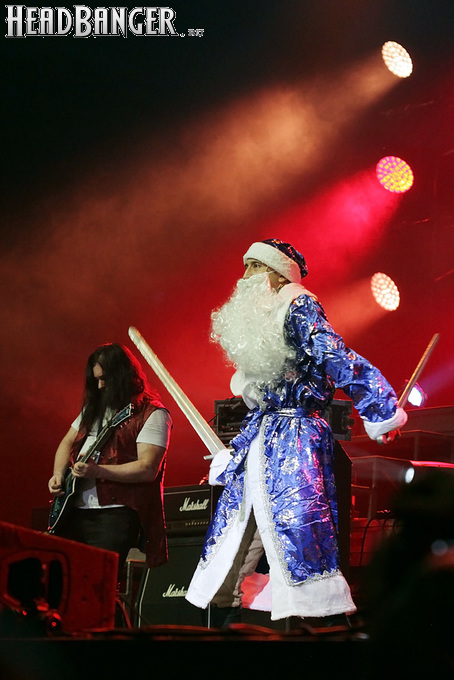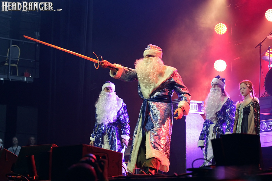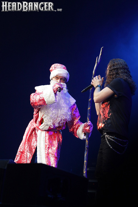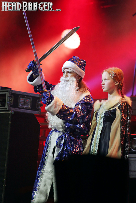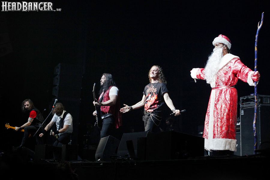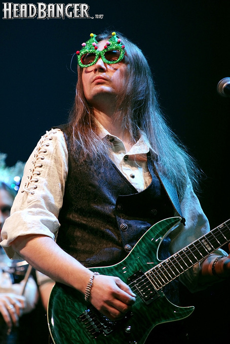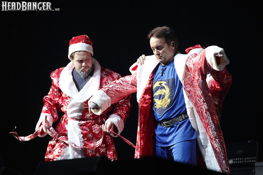 Эпидемия – еще одна группа, никогда не вызывавшая у меня симпатий, но слушательско-журналистская судьба снова и снова подкидывает мне встречи с ней. Если я не ошибаюсь, это уже пятое выступление команды Юрия Мелисова, на которое я попадаю c 1999 года, и второе с их нынешним вокалистом Евгением Егоровым, которого я когда-то видел еще в его предыдущей группе Колизей. Евгений и стал, на мой взгляд, одним из всего двух позитивных аспектов новогоднего сета, которые я могу назвать – помимо привычного чистого вокала, он, как оказалось, неплохо владеет и гроулингом. Что же касается второго позитивного аспекта, то это ранее не известная мне способность музыкантов посмеяться над собой. Программа выступления полностью состояла из песен с первой части «Эльфийской рукописи», однако всем (даже мне) хорошо знакомые песни были представлены в довольно-таки юмористической трактовке. Первый номер «Час испытания» приобрел совершенно другой, стебный текст про «драконов и орков» (Егоров читал его с экрана мобильника, и я, увы, тоже не запомнил, так что не могу процитировать точнее), а остальные песни хоть и остались прежними, но были преподнесены в новогоднем антураже. Так, в «Рожденном для битвы» специальный гость Андрей Лобашев (Харизма, экс-Arida Vortex) вышел на сцену в голубом спортивном костюме, и его прямо по ходу действа облачали в шубу и бороду Деда Мороза, а на строчке «Возьми свой меч» Андрею был вручен… огромных размеров посох! Ну а во время «Крови эльфов» музыкантам составили компанию Снегурочка и целый отряд Дедов Морозов, в длинном инструментальном проигрыше демонстрировавших навыки владения мечом. Правда, у меня сложилось такое впечатление, что собравшаяся перед сценой публика по большей части не въезжала в происходящее и юмора не оценила. Я же не въехал, отчего у второй по статусу группы фестиваля звук оказался еще хуже, чем у Catharsis. Так что минут через 20 нами было принято решение остаток этого «метал-капустника» не досматривать и прогуляться в бар, впечатливший нас космическими ценами, на точку с мерчем, впечатлившую нас еще более космическими ценами, и в фойе, которое ничем нас не впечатлило, но там ничего и не продавали.