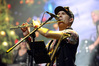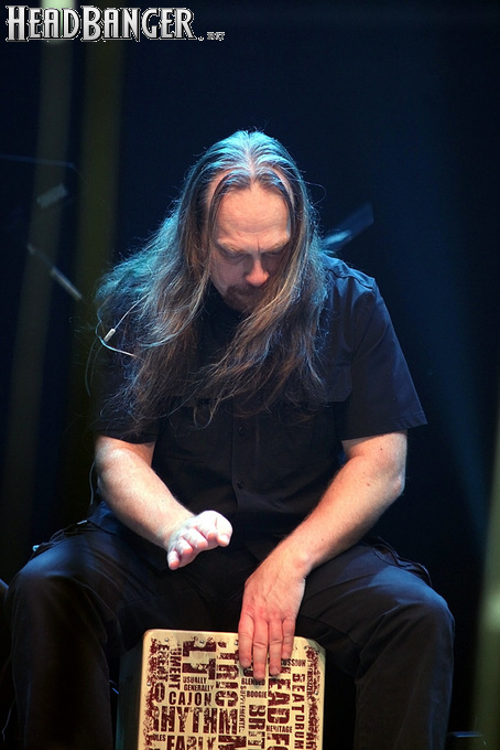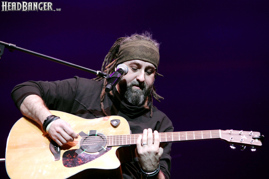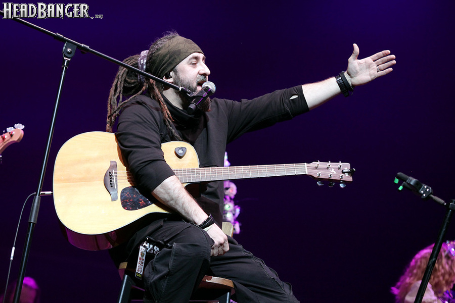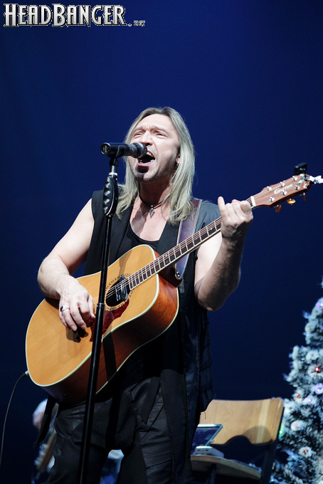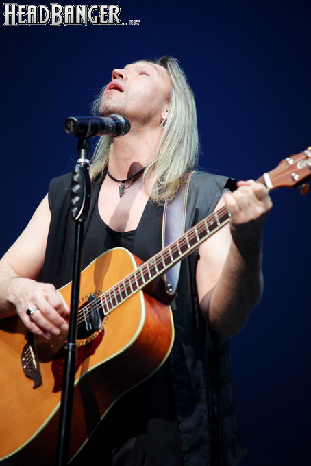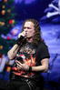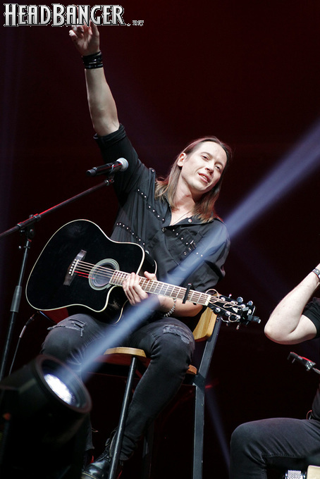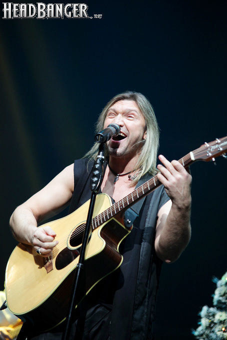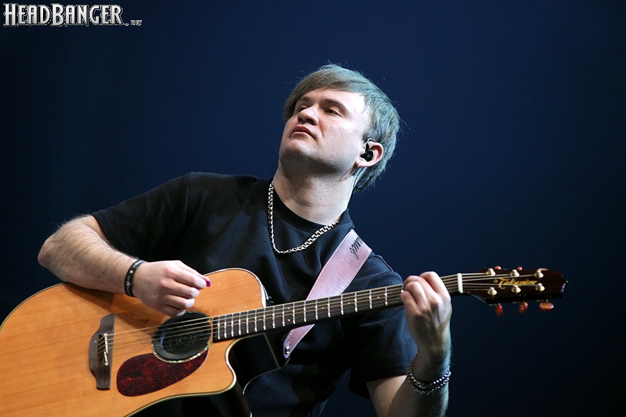 Возможность отдохнуть после мощного энергетического выплеска появилась во время следующего сета – на малой сцене с группой имени себя играл Петр Елфимов. За последние несколько лет большинство поклонников тяжелой музыки привыкло видеть Петра на месте фронтмена прекрасной команды Гран-Куражъ, однако и до нее, и одновременно с ней Елфимов занимался сольной карьерой, довольно далекой от исполняемого Гран-Куражом хард-н-хэви. Выступление на «Метал-елке» позволяло познакомить с этой стороной его творчества более тяжелую аудиторию, и Петр не преминул воспользоваться этой возможностью, включив в сет как совсем свежие синглы «Вещий» и «Я с тобой», получившие активную раскрутку на «Нашем радио», так и близкие к романсам номера «Плач надежды по мечте» и «Если хочешь вернуть» еще «докуражевских» времен. Однако металлисты активно требовали от Елфимова исполнить его знаменитую «Арию Винни-Пуха и Пятачка» и под конец выступления добились-таки своего, пусть и в акустическом, далеком от оригинального, но тоже довольно смешном формате. Кстати, весьма далеки от студийных и акустические версии вышеупомянутых синглов – тем, кто слышал их впервые, сольное творчество Петра могло показаться чересчур лирическим, хотя на самом деле тяжелых гитар в нем тоже хватает. Хотя, это, конечно, ни в коем случае не «Царство диких людей» и не «Адреналин», так что если Гран-Куражъ все-таки встанет на паузу из-за занятости гитариста Михаила Бугаева в Арии, я лично сильно расстроюсь.