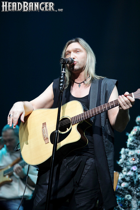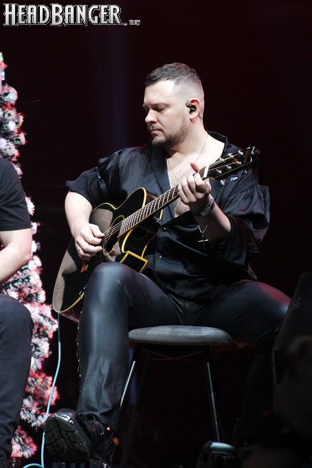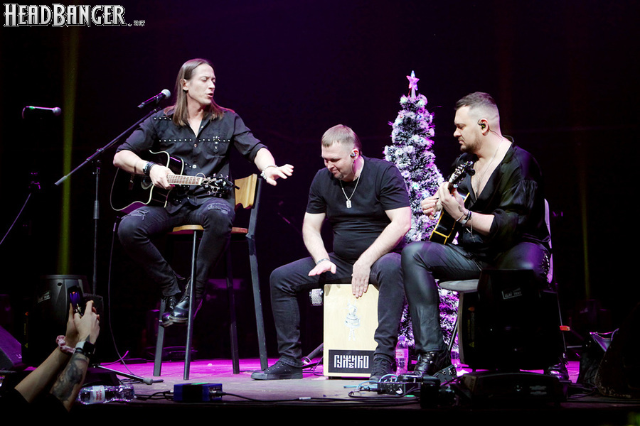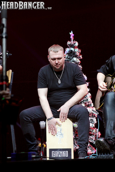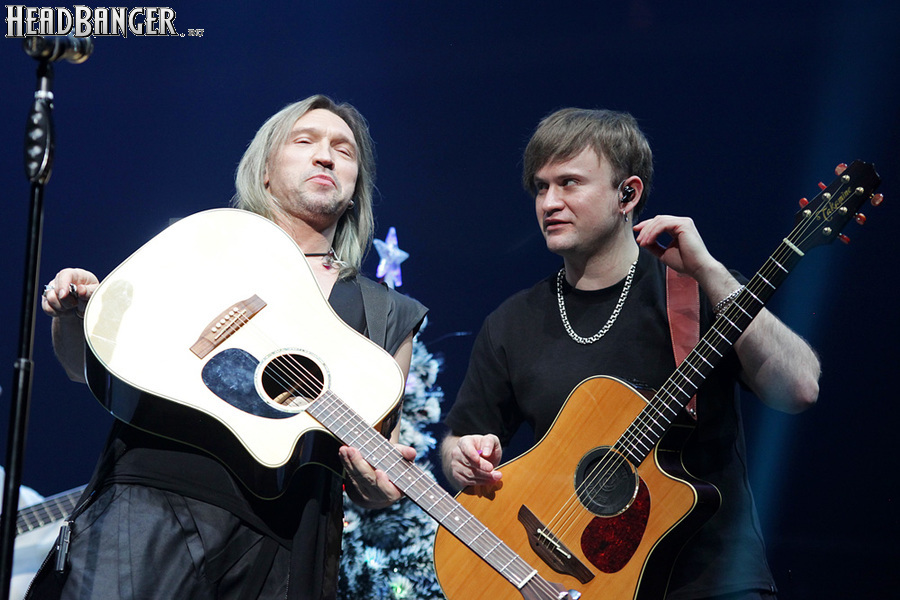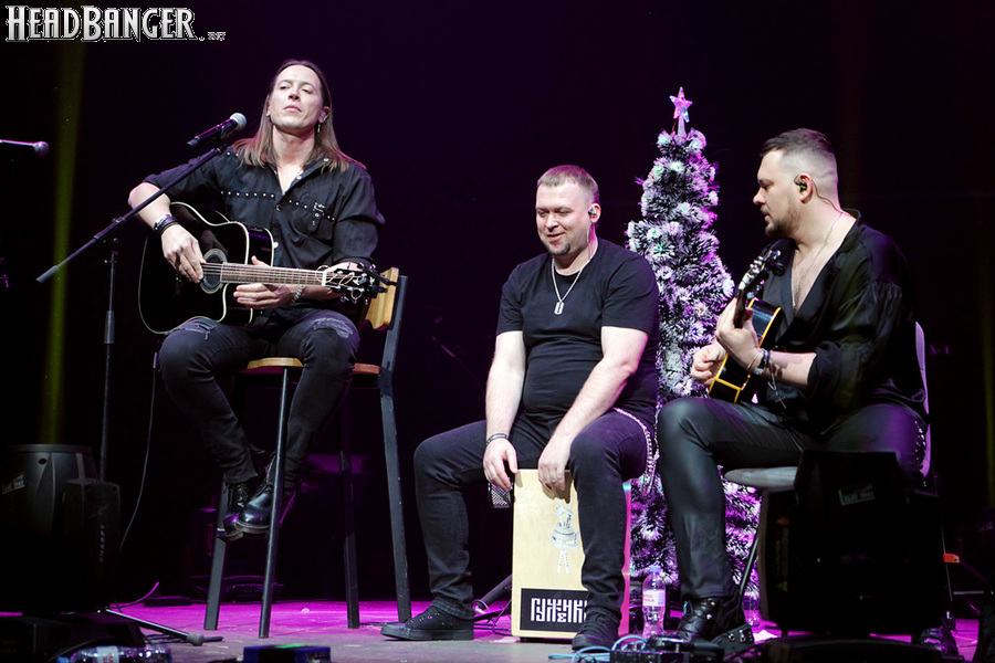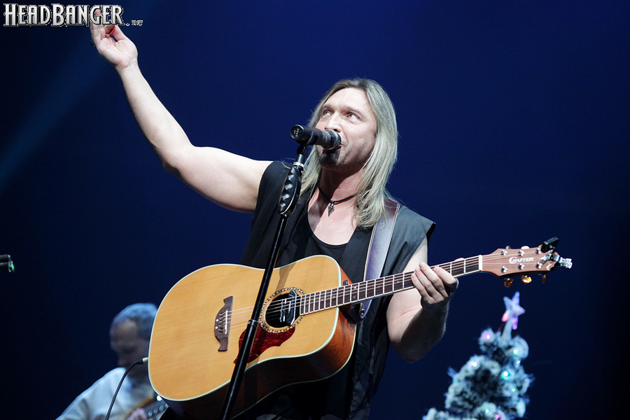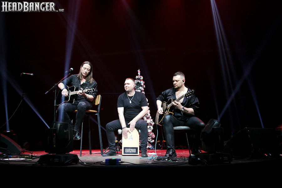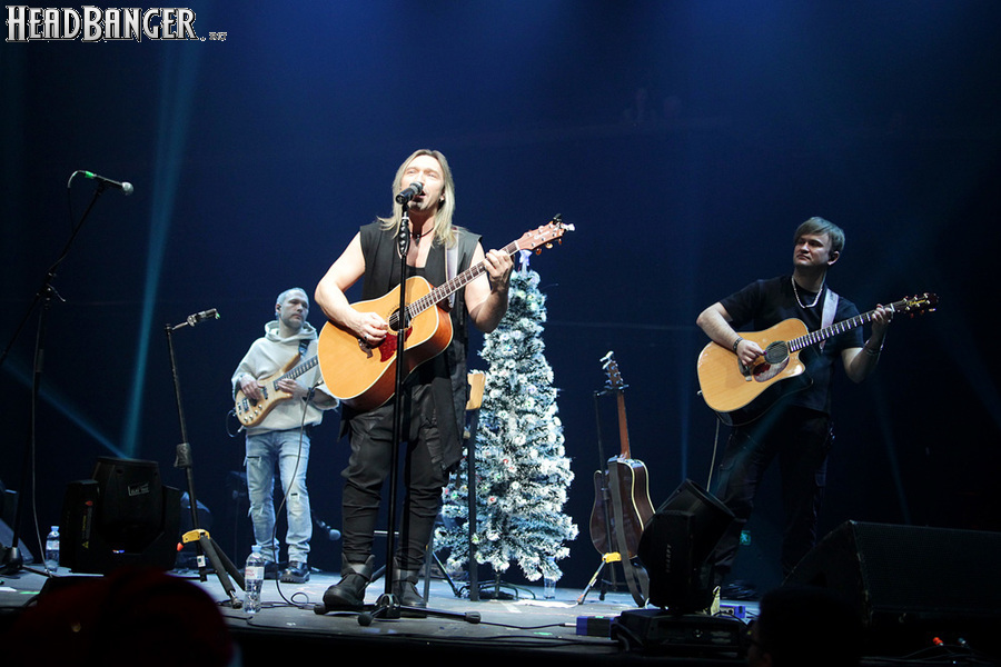 Посещать «Стадиум» мне приходилось немало раз, но даже на «Ария-фестах», которые эта площадка принимала в начале десятых годов, сцена там была только одна, поэтому, читая анонс мероприятия, я никак не мог себе представить, куда организаторы впихнут второе возвышение для артистов. Оказалось, что малую сцену возвели у правой стены на стыке фанзоны и танцевального партера, так что менять дислокацию в поисках лучшего обзора приходилось только зрителям в фанзоне, да и им не требовалось бежать так уж далеко. Как оказалось очень скоро, это большой плюс, потому что выступления на большой и малой сценах сменяли друг друга с паузами максимум в пару минут. Стоило Amalgama раскланяться, как зажегся свет на скромном круге с елочкой посередине, под которой обнаружился Сергей Маврин в компании со своей гитарой. В этот вечер он играл сольную инструментальную программу, которую составили как изначально инструментальные композиции, например, «Фортуна», так и безвокальные версии известных песенных произведений Сергея - «Стрелы в небо», «Боль, что осталась от нас» и т.д. На концерты Маврина с его группой, как бы она ни называлась, я регулярно хожу вот уже более четверти века, но в формате «без ансамбля» мне довелось увидеть его в этот вечер впервые. 30-минутный сет оставил после себя в целом позитивные впечатления, так что если вам импонирует манера игры Сергея, побывать на его инструментальном выступлении хотя бы раз однозначно стоит. Особенно приятны моменты, когда публика узнает знаковые песни и подпевает им даже без вокала из порталов. Ложку дегтя внесла лишь пара моментов – какие-то заминки с запуском фонограммы ритм-секции в начале сета (возможно, именно из-за них Сергей все выступление был погружен в себя и улыбался меньше, чем я привык видеть) и скомканный финал. График выступлений на мероприятии получился настолько плотным, что, видимо, техникам была дана команда обеспечить его соблюдение любой ценой. И если Владу Ивойлову по истечении отведенных 30 минут они всего лишь отключили микрофон, не дав попрощаться с публикой, то Маврину попросту вырубили порталы посередине номера, причем он, слыша себя только в ушных мониторах, не сразу осознал, что играет в пустоту, и еще чуть ли не минуту беззвучно для публики перебирал пальцами по грифу. Мера, возможно, оправданная в данных условиях, но, честно говоря, не особенно красивая не только по отношению к артисту, но и по отношению к публике, ради которой, по идее, все и делается.
