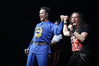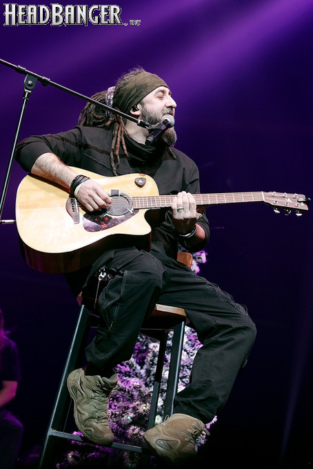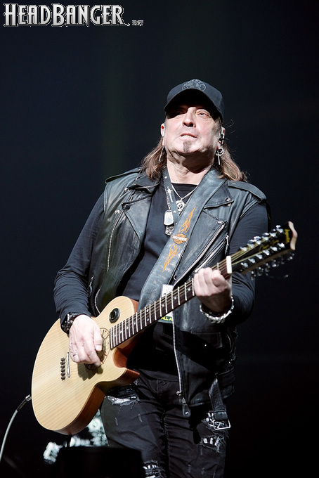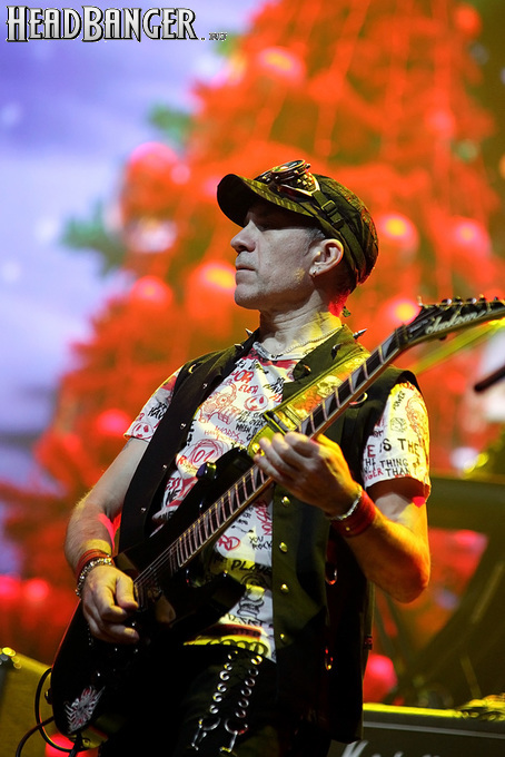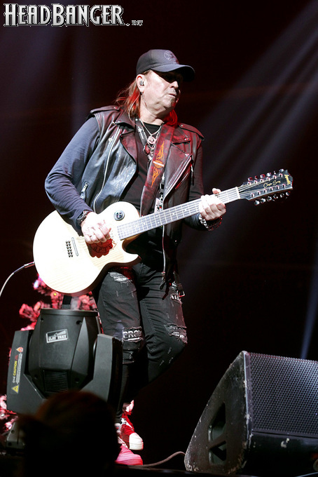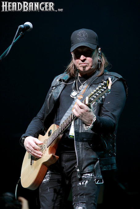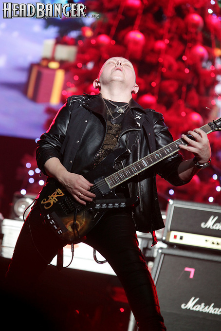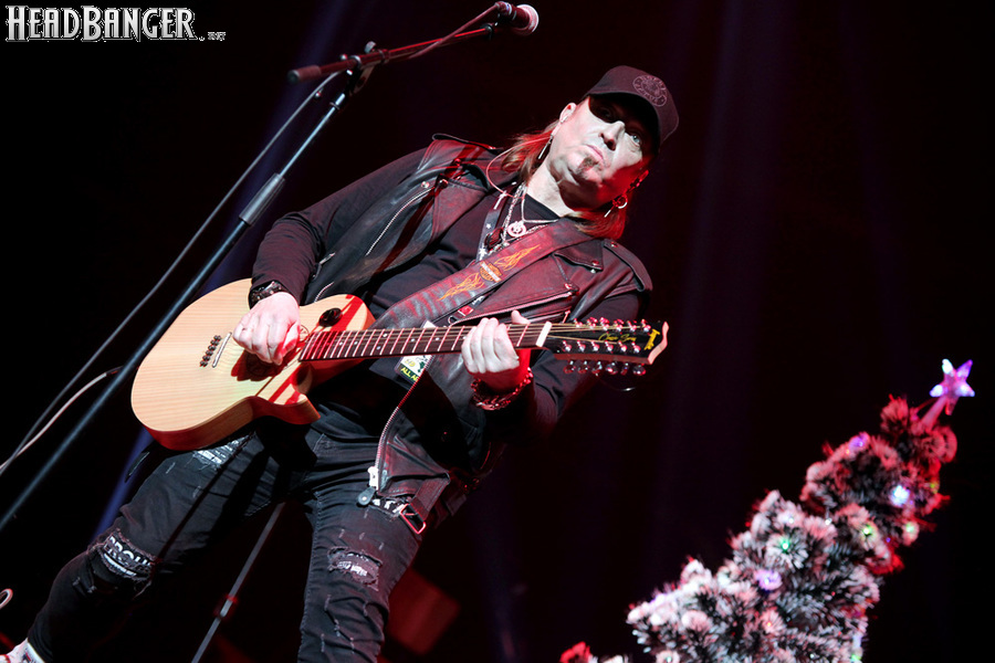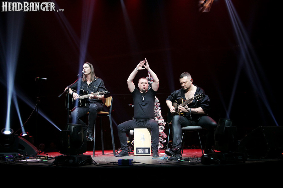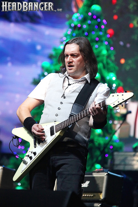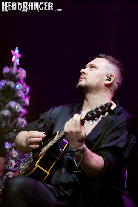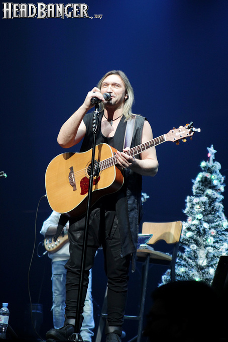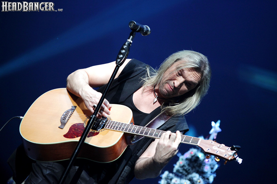 Посещать «Стадиум» мне приходилось немало раз, но даже на «Ария-фестах», которые эта площадка принимала в начале десятых годов, сцена там была только одна, поэтому, читая анонс мероприятия, я никак не мог себе представить, куда организаторы впихнут второе возвышение для артистов. Оказалось, что малую сцену возвели у правой стены на стыке фанзоны и танцевального партера, так что менять дислокацию в поисках лучшего обзора приходилось только зрителям в фанзоне, да и им не требовалось бежать так уж далеко. Как оказалось очень скоро, это большой плюс, потому что выступления на большой и малой сценах сменяли друг друга с паузами максимум в пару минут. Стоило Amalgama раскланяться, как зажегся свет на скромном круге с елочкой посередине, под которой обнаружился Сергей Маврин в компании со своей гитарой. В этот вечер он играл сольную инструментальную программу, которую составили как изначально инструментальные композиции, например, «Фортуна», так и безвокальные версии известных песенных произведений Сергея - «Стрелы в небо», «Боль, что осталась от нас» и т.д. На концерты Маврина с его группой, как бы она ни называлась, я регулярно хожу вот уже более четверти века, но в формате «без ансамбля» мне довелось увидеть его в этот вечер впервые. 30-минутный сет оставил после себя в целом позитивные впечатления, так что если вам импонирует манера игры Сергея, побывать на его инструментальном выступлении хотя бы раз однозначно стоит. Особенно приятны моменты, когда публика узнает знаковые песни и подпевает им даже без вокала из порталов. Ложку дегтя внесла лишь пара моментов – какие-то заминки с запуском фонограммы ритм-секции в начале сета (возможно, именно из-за них Сергей все выступление был погружен в себя и улыбался меньше, чем я привык видеть) и скомканный финал. График выступлений на мероприятии получился настолько плотным, что, видимо, техникам была дана команда обеспечить его соблюдение любой ценой. И если Владу Ивойлову по истечении отведенных 30 минут они всего лишь отключили микрофон, не дав попрощаться с публикой, то Маврину попросту вырубили порталы посередине номера, причем он, слыша себя только в ушных мониторах, не сразу осознал, что играет в пустоту, и еще чуть ли не минуту беззвучно для публики перебирал пальцами по грифу. Мера, возможно, оправданная в данных условиях, но, честно говоря, не особенно красивая не только по отношению к артисту, но и по отношению к публике, ради которой, по идее, все и делается.