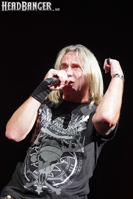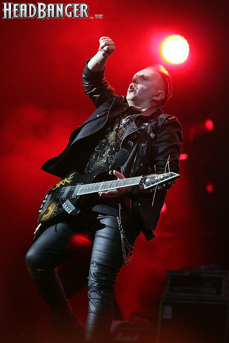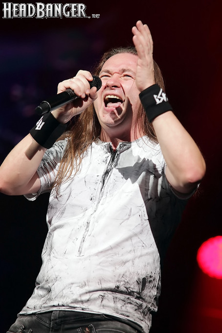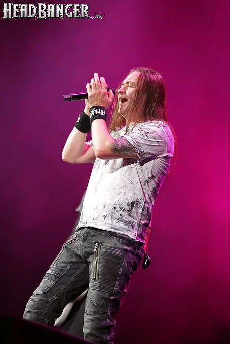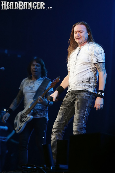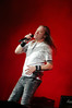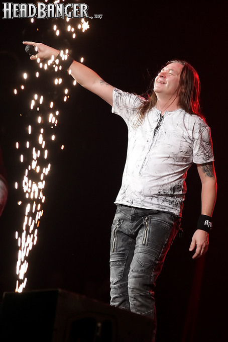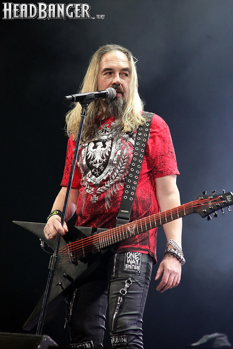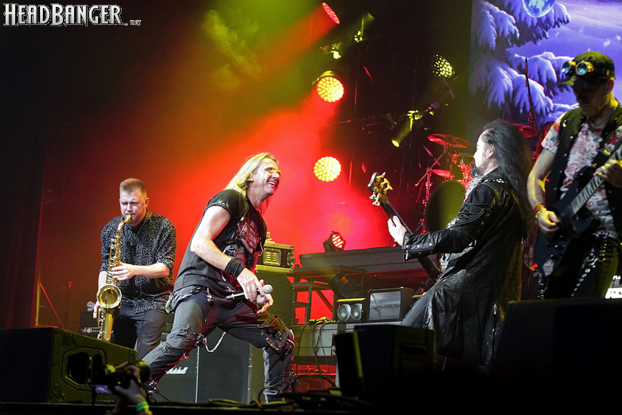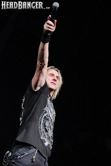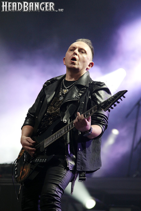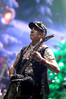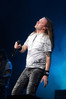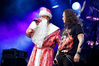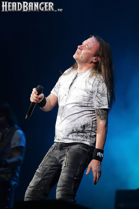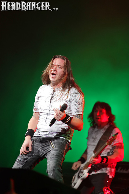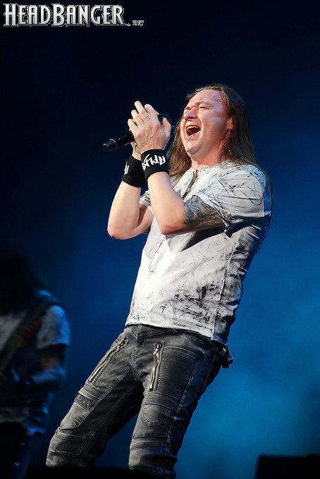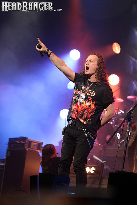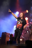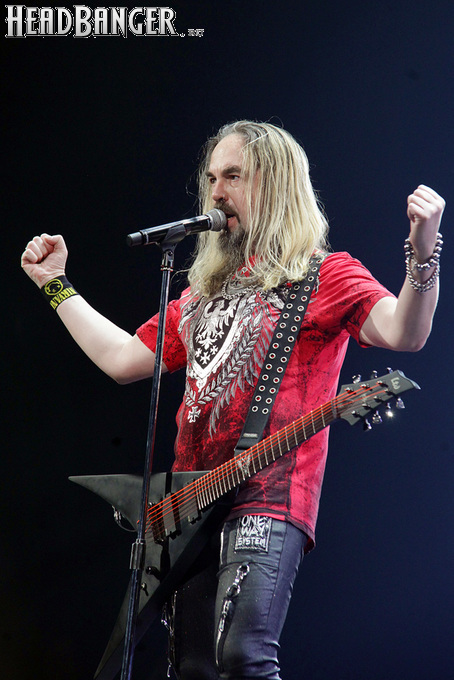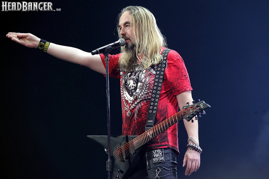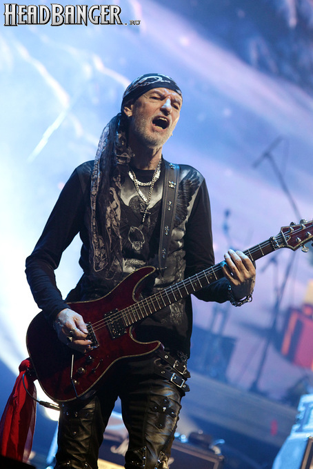 А тем временем как раз Ария и готовилась к выходу на основную сцену. К выступлению хэдлайнеров ее основательно переоборудовали – если все предыдущие группы играли на двух барабанных установках, возведенных на третьем ярусе, то для Максима Удалова выставили собственные барабаны, занявшие место по центру нижнего яруса. Не знаю, насколько эти перестановки соотносились с качеством звука, но по сравнению с Catharsis и Эпидемией оно улучшилось прямо-таки радикально и приближалось к идеалу. Годы гастролей по российским городам и весям закалили музыкантов, и первоклассное шоу они выдают, даже если из порталов доносится сущий «адъ и Израиль», но слушать их нетленные хиты с саундом ведущих европейских фестивалей – особое удовольствие.