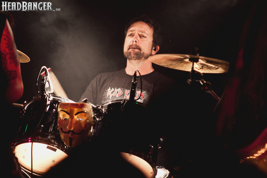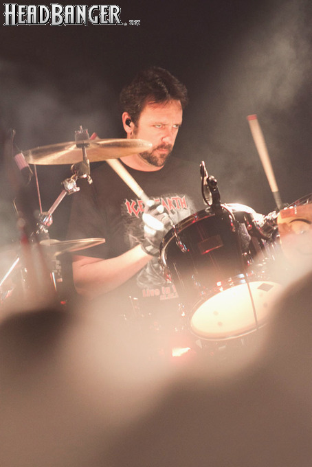 Конечно, впечатляет не только образ музыкантов, но и мастерство, с которым у Iced Earth полный порядок. В частности, тем вечером все мы смогли убедиться в том, что есть, есть ещё барабанщики, которые ровно играют ногами. Поблагодарить за такую возможность следует не только Джона Детте, который действительно хорошо справился со своими партиями, но и звукорежиссёра, который вывел бочку фактически на уровень вокала. Однако в отношении парня за пультом слово «поблагодарить» необходимо поставить в кавычки – как уже было сказано, бочка оказалась на переднем плане, малый барабан звучал примерно там же, ритм-гитара Шаффера забивала соло-гитару Троя Сила даже напротив усилителя солирующего. Может показаться кощунством, но на первых двух песнях, когда у Джона Шаффера возникали проблемы с коммутацией гитары и усилителя, звук в целом становился более читаемым. А в остальное время вокал, и так потеснённый с первых позиций ударными, регулярно терялся в гитарах – видимо, совпадали частоты. Не отставал от коллеги и бравый светотехник в шлеме и так и не снятой маске – от эпилептических прожекторов после концерта натурально болели глаза. И всё это в «Зале Ожидания», где, на моей памяти, традиционно благополучные звук и свет!