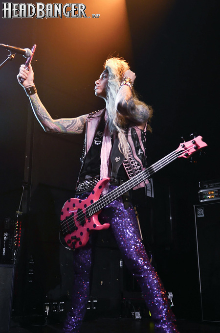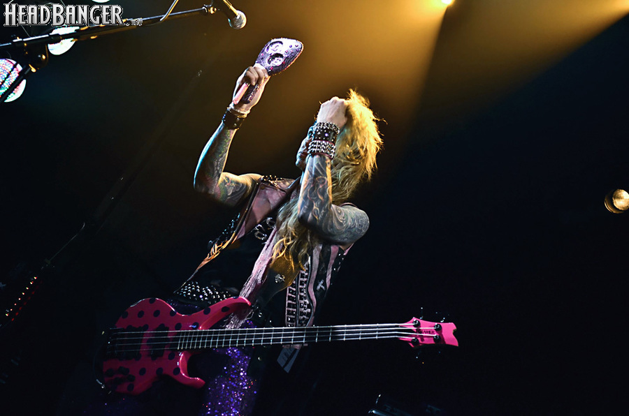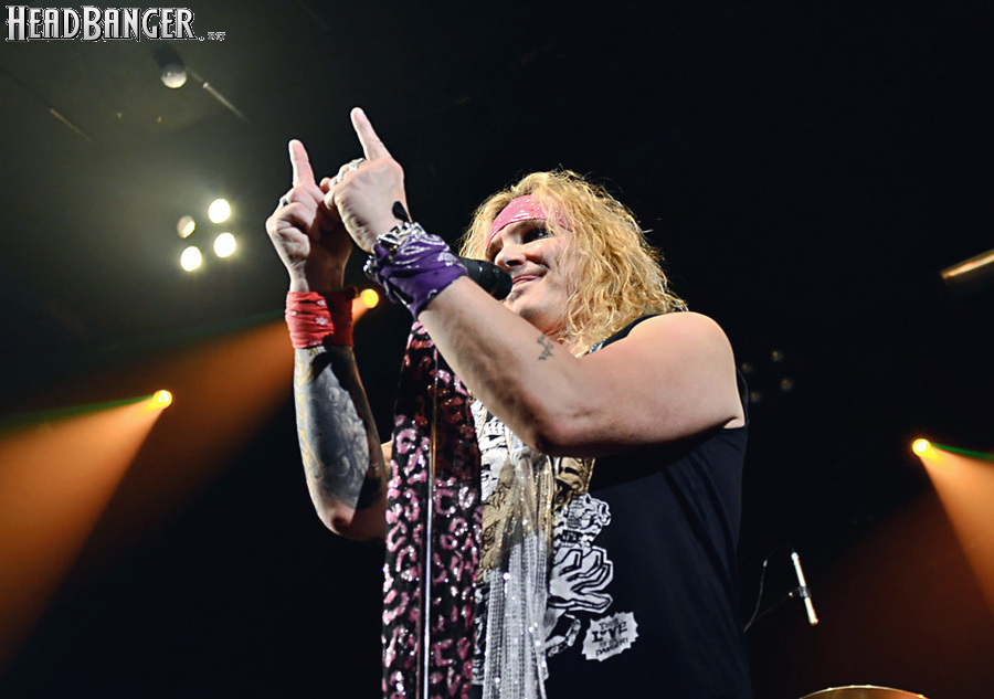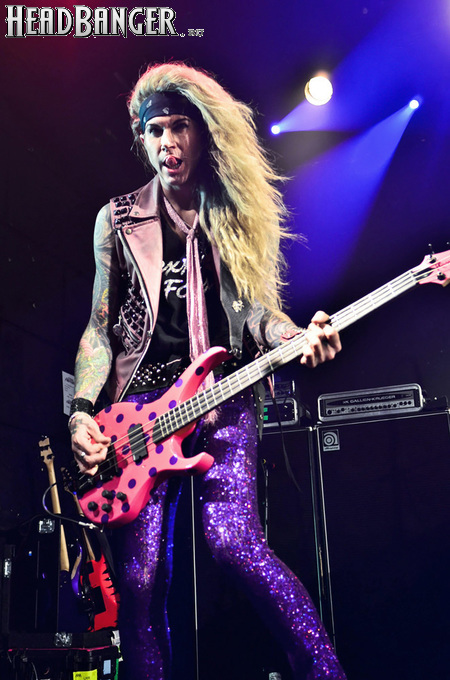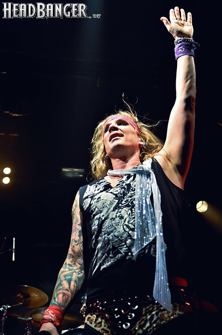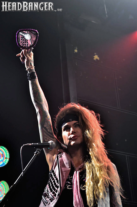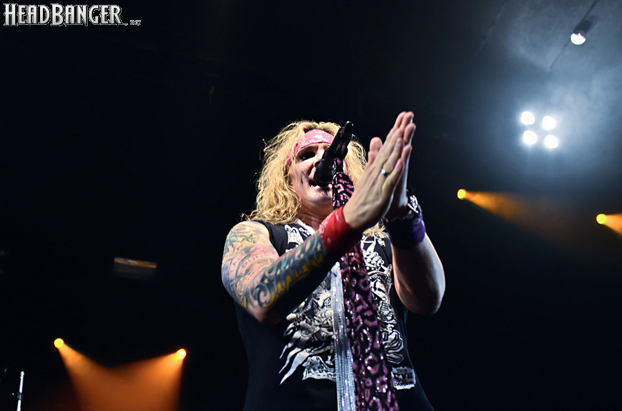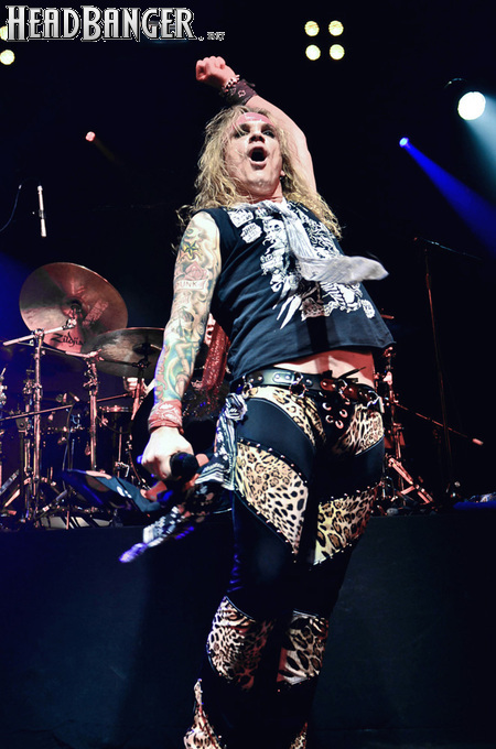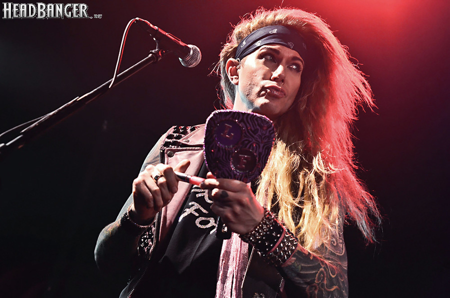 Steel Panther – это пародийная группа, начиная от образов (один басист Лекси Фокс с косметичкой и зеркалом чего стоит) и заканчивая лирикой, полной всяких непристойностей. Отдельно стоит отметить диалоги музыкантов между песнями, порой длящиеся около 5 минут. У меня были опасения, что все эти многочисленные шутки ниже пояса пройдут «мимо кассы» по причине плохого знания английского языка у российской публики, а ведь концерты Steel Panther становятся особенными во многом и из-за этих диалогов. К счастью, преодолевать языковой барьер в этот раз не пришлось. Кроме того, во время разговоров Сэтчел блеснул и знанием русского языка, но не банальными словами благодарностями, как это обычно бывает, а в контексте собственного творчества. Фразы «Show your p*zda» и«Sosi moy h*i», которые произносились по шпаргалке, написанной прямо на руке (прям как ученик на экзамене, подумалось мне), имели большой резонанс среди публики, чему Сэтчел был очень рад, судя по его широченной улыбке.