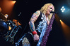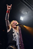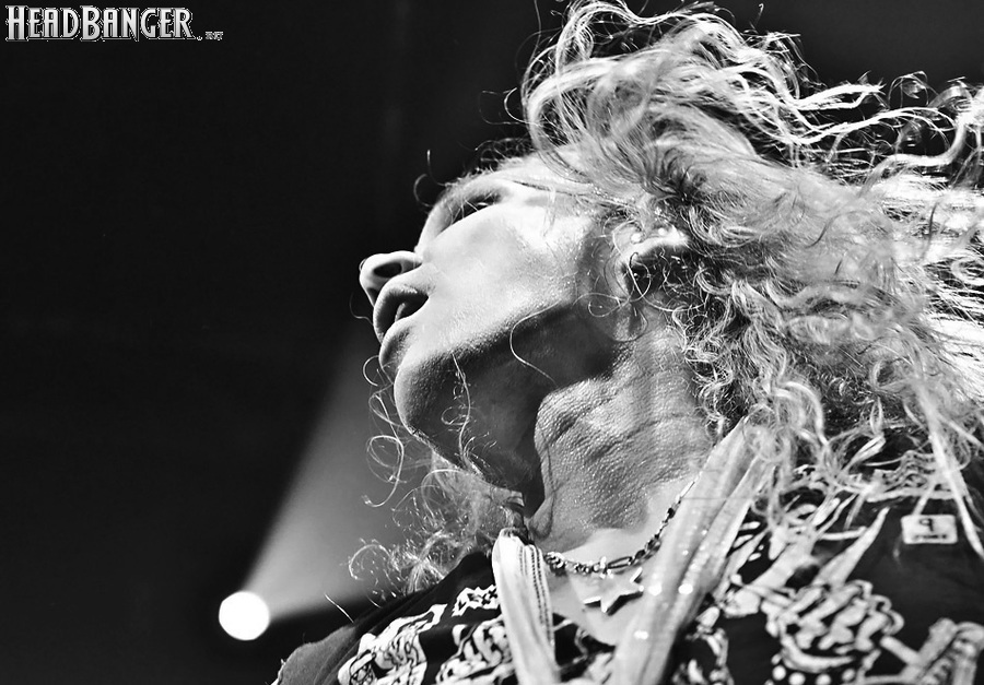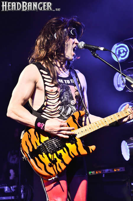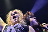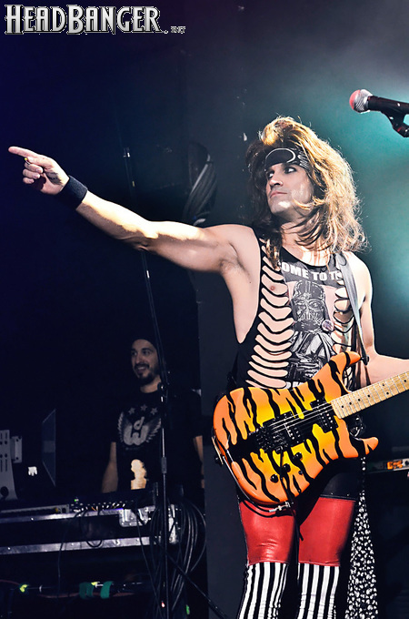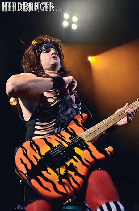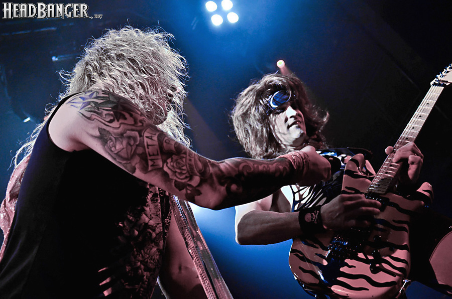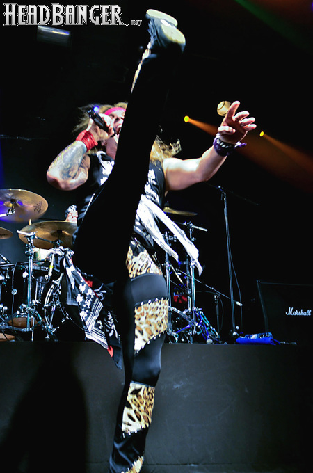 Несмотря на столь узкую направленность, лирика Steel Panther полна всяких оборотов и идиом, которые трудно понять слабо говорящему на английском языке человеку, однако сама по себе музыка группы исключительно хитова и просто не может не цеплять. Начиная с ураганной открывашки “Eye Of A Panther” и заканчивая “Party All Day (Fuck All Night)”, это была настоящая рок-н-ролльная вечеринка, “like tomorrow is the end of the world”. Этот тур, носящий название «Распространяющий заразу», призван подогреть интерес аудитории к выходящему в конце марта альбому “All You Can Eat”, поэтому с него были сыграны уже упомянутая “Party Like Tomorrow Is The End Of The World” и “Gloryhole” (ну, о чем она, вы уже поняли). На время последних трёх песен основного сета на сцену было приглашено около десяти представительниц прекрасной половины человечества (к огромному удивлению, подавляющее большинство из них были очень даже ничего, а не как это обычно бывает) – стандартная фишка каждого концерта Steel Panther. К ним были обращены стандартные для данной группы призывы “show your boobs and p*zda”, причем некоторыми эти просьбы были выполнены - к большой радости мужской половины пришедших. Вообще, оголённых женских прелестей в этот вечер было замечено приличное количество, так же как и лифчиков, кинутых на сцену («Он воняет!», «Моей спермой!»).