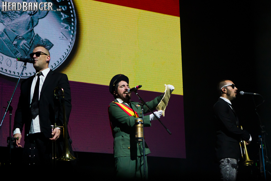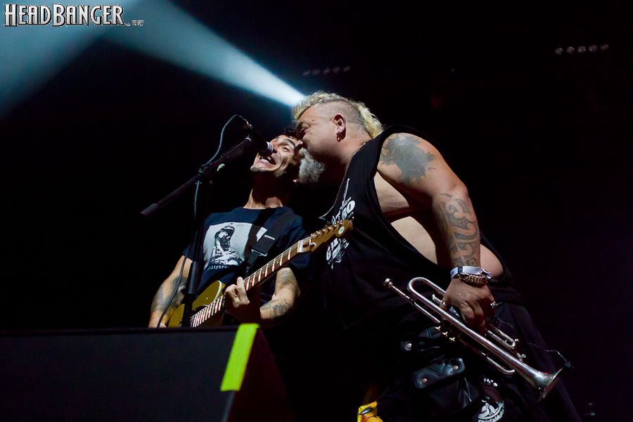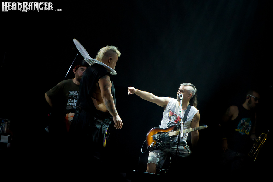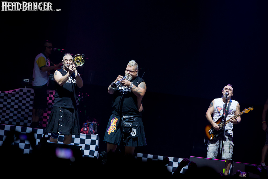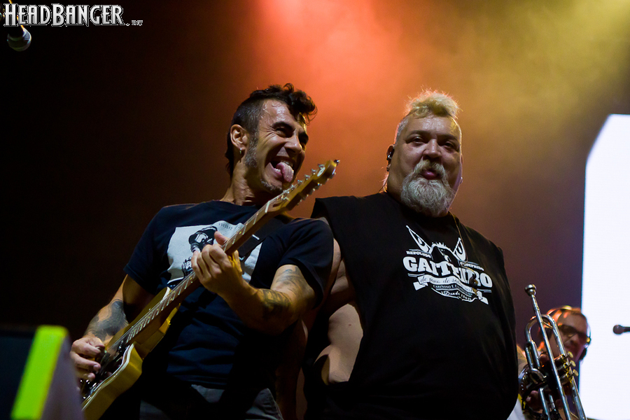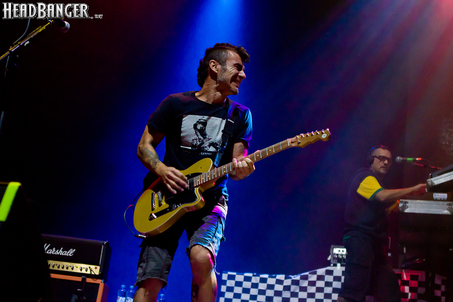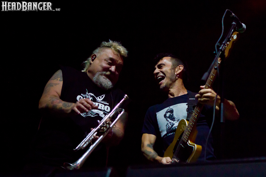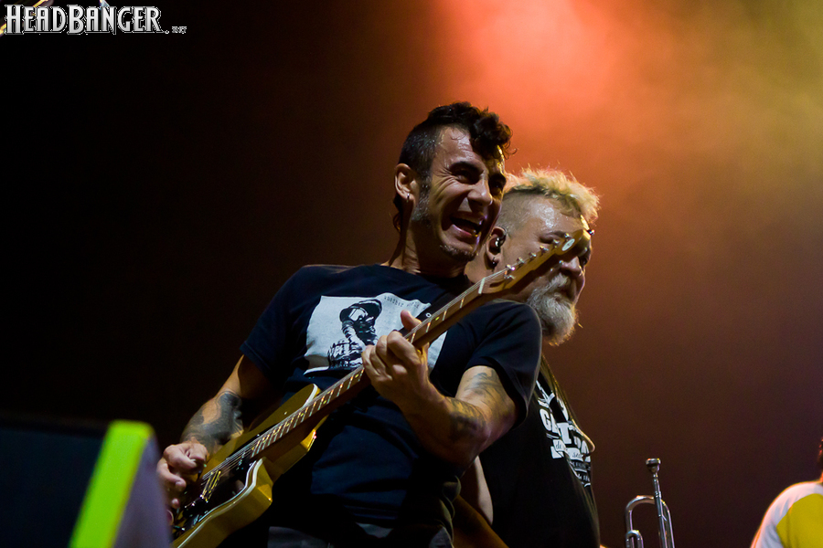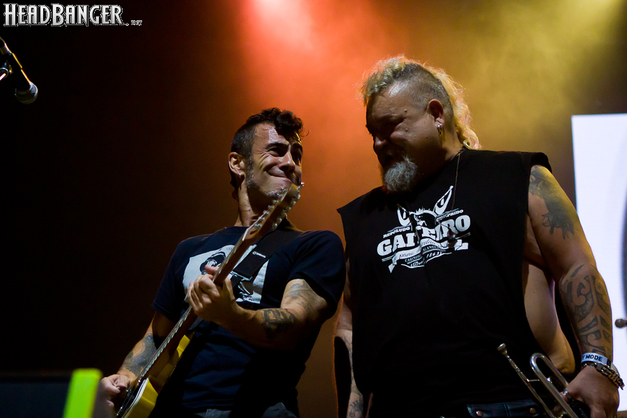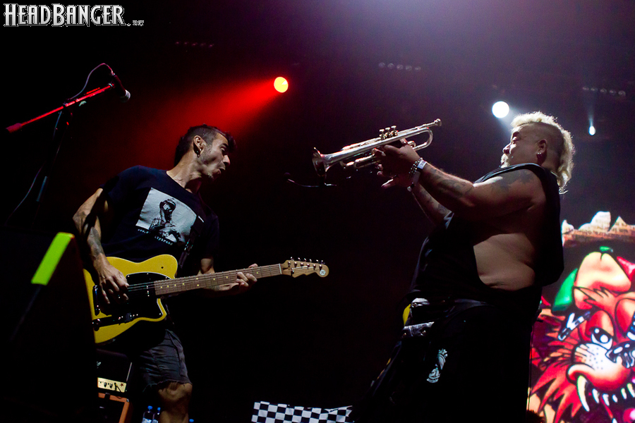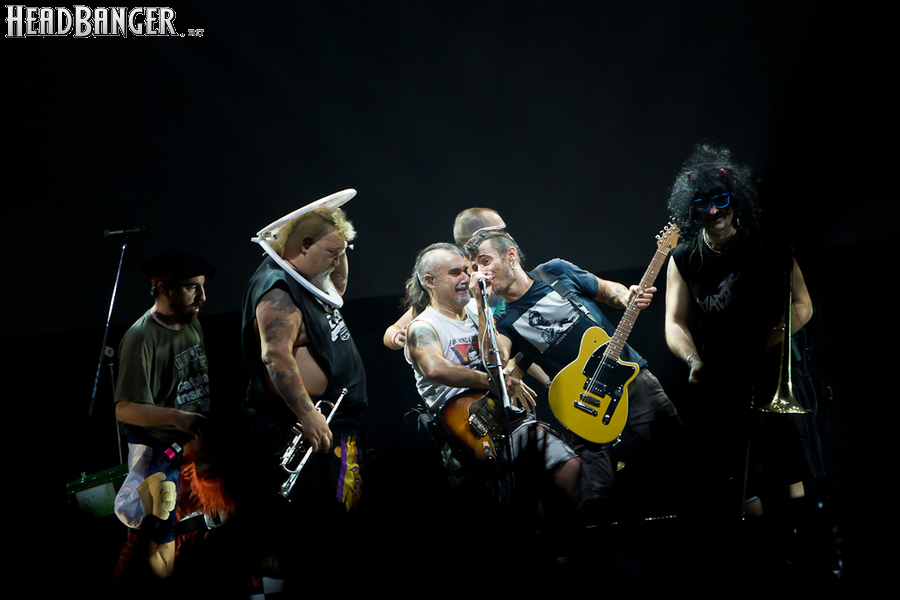 Тут нельзя не провести параллели с Toy Dolls — точно такое же веселье одновременно с высочайшим уровнем владения инструментами. И не могу не вспомнить виденное как-то раз выступление недогруппы Красная Плесень - это было в триллион раз колхознее и унылее, чем та феерия, которую выдали Ska-P, что сейчас, что в 2014-м. Удовольствие от такого качества и класса было колоссальным. Отдельный вопрос — благодаря или вопреки тому, что песни "спанишей" исполняются исключительно на родном языке. Хотя название сыгранного примерно посередине шоу хита "Cannabis", вызвавшего всеобщее ликование и практически стояние на ушах, понятно без знания испанского.