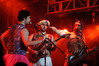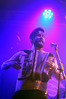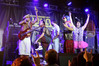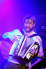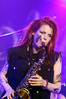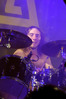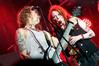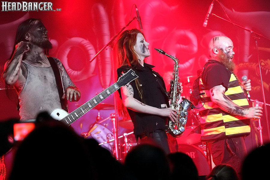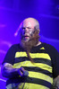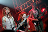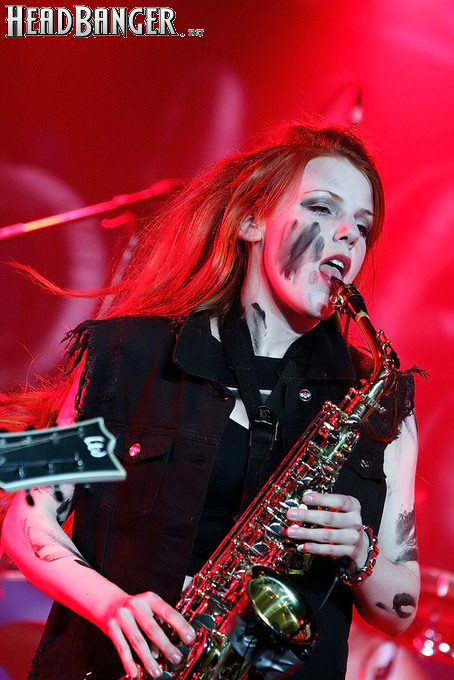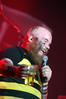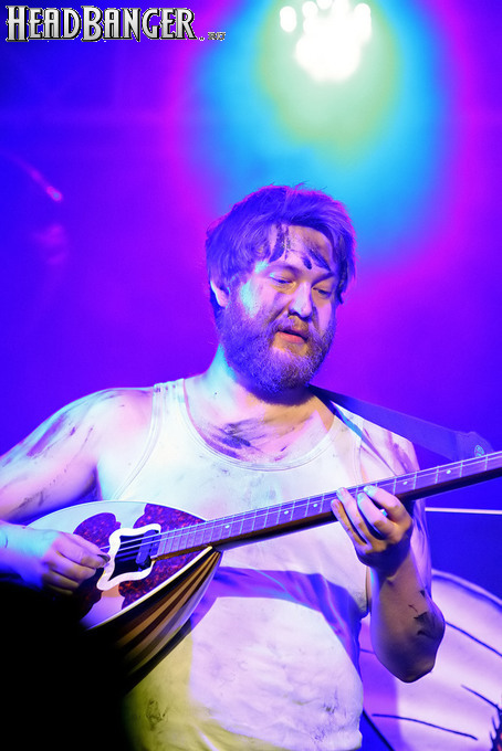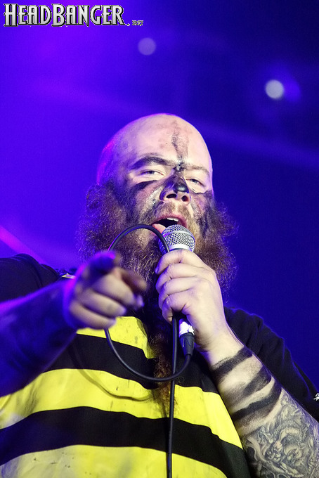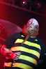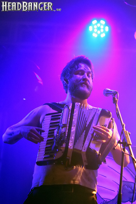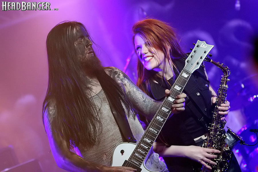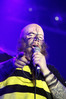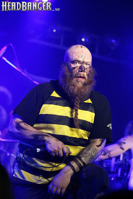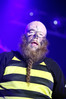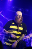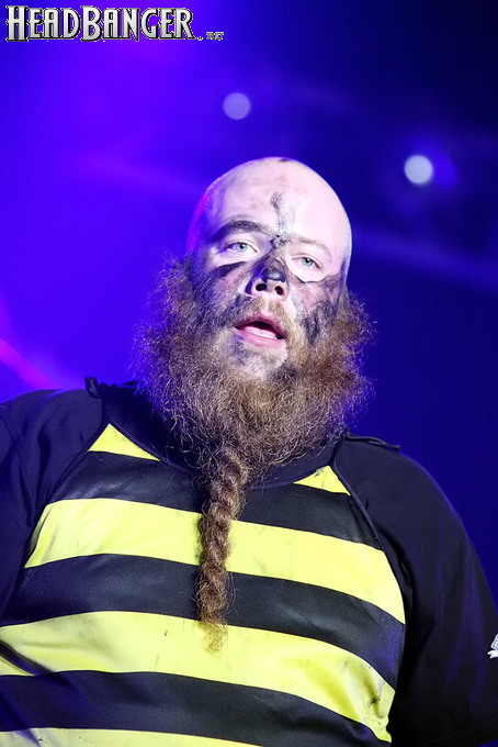 Норвежские тролли единственные из трех команд вечера уже имели опыт выступлений в России – в 2009 году им доверили открывать «Октобирфест», хэдлайнером которого был уже упомянутый Онкель Том. С тех пор дискография Trollfest приросла двумя альбомами, в том числе совершенно сногсшибательным “Brumlebassen” (2012), и именно его «пчелиная» тематика служит теперь основой для оформления сцены и костюмов музыкантов. Напомню, что Брумлебассен – это один из персонажей придуманной участниками группы «троллиной вселенной», который настолько увлечен разведением пчел и приготовлением обожаемого троллями хмельного меда, что втайне сам мечтает стать пчелой. Вживую роль Брумлебассена исполняет вокалист Троллманнен – дядька весьма внушительной комплекции и с длиннющей бородой, который смотрится очень колоритно в «билайновской» футболке с желтыми и черными полосками. Впрочем, у каждого из троллей свой запоминающийся имидж – так, коротко стриженый блондин-аккордеонист не «выпадал бы из контекста» в любой русской деревне, а скрипачке, наоборот, самое место на страницах модных журналов. К сожалению, и того, и другую было плоховато слышно – «тролли» звучали громко и мощно, но несколько хаотично, а такая «закручено» аранжированная музыка все-таки требует более тщательного подхода к настройке. Тем не менее, выступление Trollfest впечатлило – и небанальной музыкой, в которой, несмотря на шквалистый характер звука, все-таки прослушивалось что-то балканское, и энергетикой, которая может заставить плясать даже калек (это не шутка – перед сценой был замечен молодой человек, размахивающий натуральными костылями), и отличной подборкой песен, в которую, наряду с материалом «Брумлебассена», вошли и лучшие хиты прошлых лет – “Brakebein”, “Der JagerMeister”, “Essenfest” и др. Единственное, что реально напрягло – это уровень громкости: Trollfest, видимо, решили, что их хэдлайнерское положение относится и к положению ручек на пульте, а в полупустом зале звуковой шквал такой силы выдерживать больше часа лично мне сложновато. К счастью, норвежцы примерно столько и играли, завершив программу убойными “Rundt Balet” c “Brumlebassen” и “Helvetes Hunden Garm” c дебютника 2005 года “Wilkommen Folk Tell Drekka Fest”.