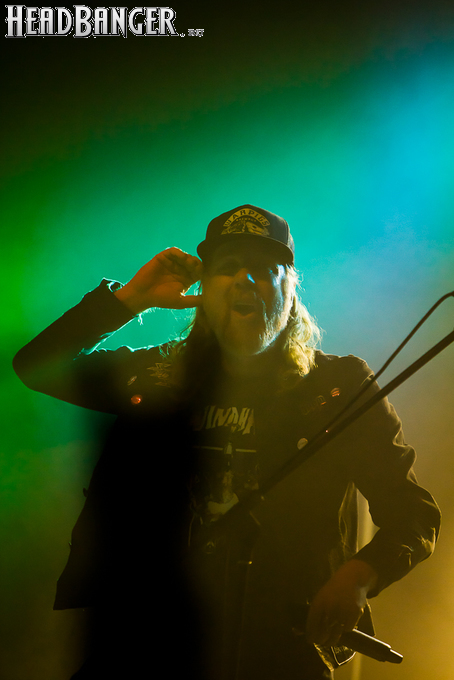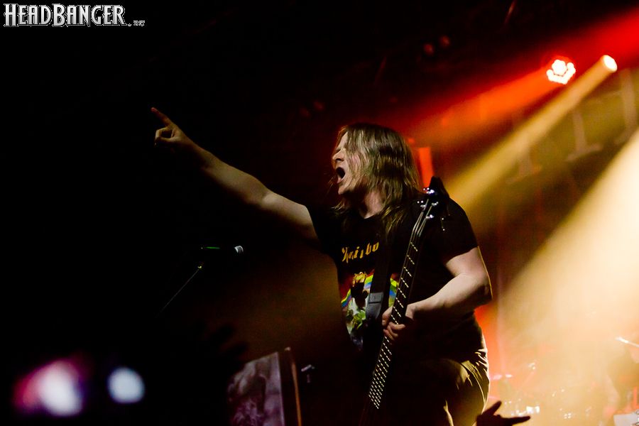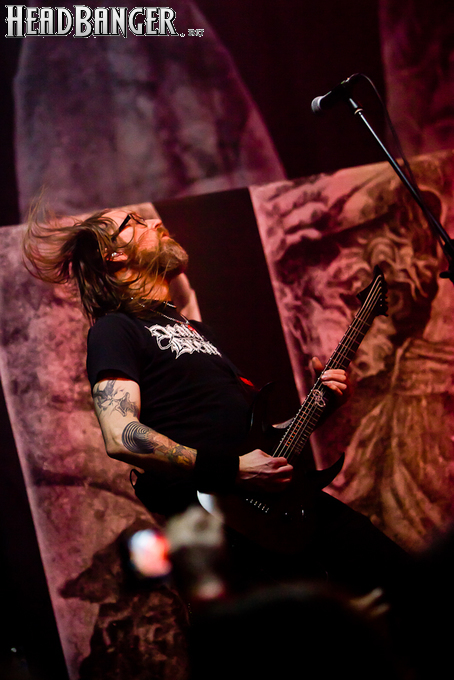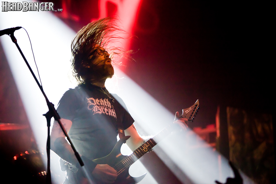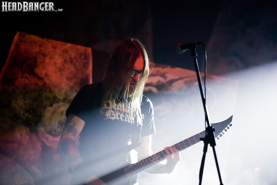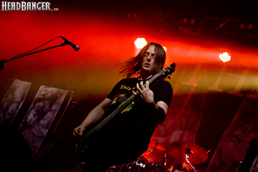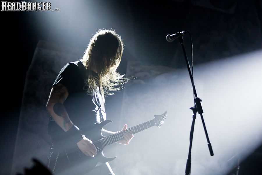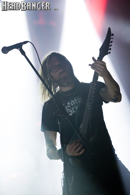 Тем временем танцпол постепенно заполнился. До аншлага было далеко, но и на пустой зал не посетуешь – приличное число народу, однако спокойно можно было передвигаться. А в 21:40 со звуками вступительной интродукции “Der Widerstand” на сцене появились At The Gates и с первой же композиции “To Drink From The Night Itself” показали зрителям, “кто в доме хозяин”. Несмотря на то, что годы берут свое, и, как отметил мой питерский коллега в отчете о прошлом концерте шведов, вокалист Томас Линдберг “внешне напоминает постаревшего Чака Норриса”, глотка у него по-прежнему луженая и коррозии не поддается. То же самое можно сказать и обо всех остальных музыкантах At The Gates – возрастные, обородевшие татуированные шведские ветераны, не утратившие ни грамма мастерства. И даже “потеря бойца” –гитариста и одного из основателей Андерса Бьёрлера, случившаяся пару лет назад, не пошатнула этих дядек - на его место взяли не менее матёрого мужика, Йонаса Сталхаммара, ранее игравшего в куче различных коллективов, включая не так давно выступавших в Москве The Crown. Впрочем, богатым послужным списком могут похвастаться все без исключения музыканты At The Gates (например, басист Йонас Бьёрлер и ударник Эдриан Эрландссон без отрыва от основной группы играют в The Haunted, а последний их них ранее отметился в безбрежном море металлических звёзд различных направлений – от Paradise Lost и Cradle Of Filth до грайндовых латиносов Brujeria).