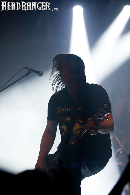 Уже со следующим треком шведы перешли к собственной классике. Линдберг рявкает свое знаменитое “Go!”, предваряющее начало нетленки “Slaughter Of The Soul” с одноименного альбома 1995 года, и вот они - те самые мощные фирменные гитарные «галопы» группы, сменяющиеся на мелодичные соло-проигрыши и обратно, которые породили легионы последователей по всему миру. Стоять столбом на танцполе и равнодушно взирать на такой драйв просто невозможно, и вот уже мы вместе с лидером Seducer’s Embrace Алексеем Доховым и его прекрасной супругой Кристиной вовсю крутим “мельницы” под данную песню! Тем более, что Линдберг, как я уже отмечал, находится в прекрасной вокальной форме и нигде не фальшивит.
