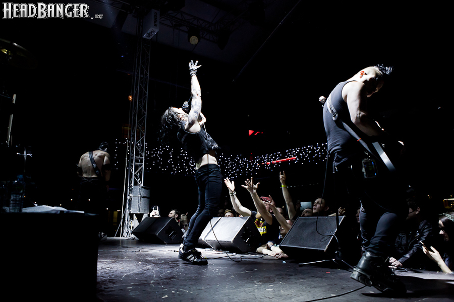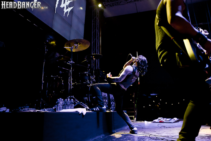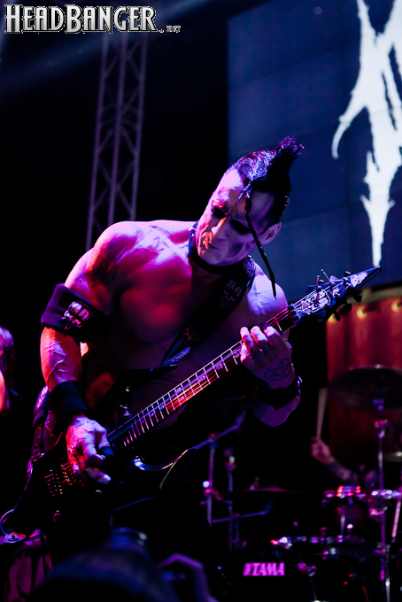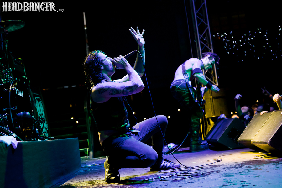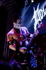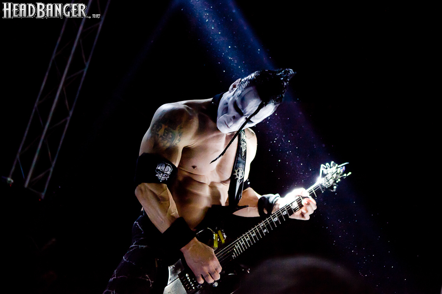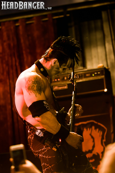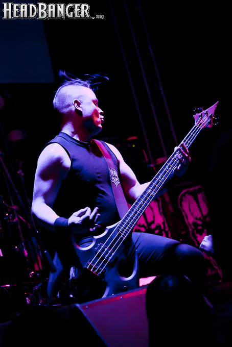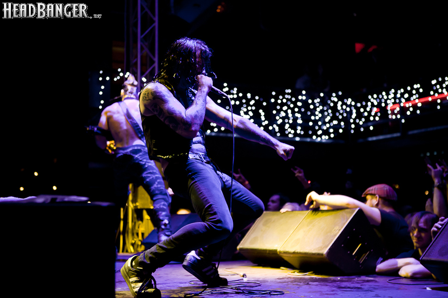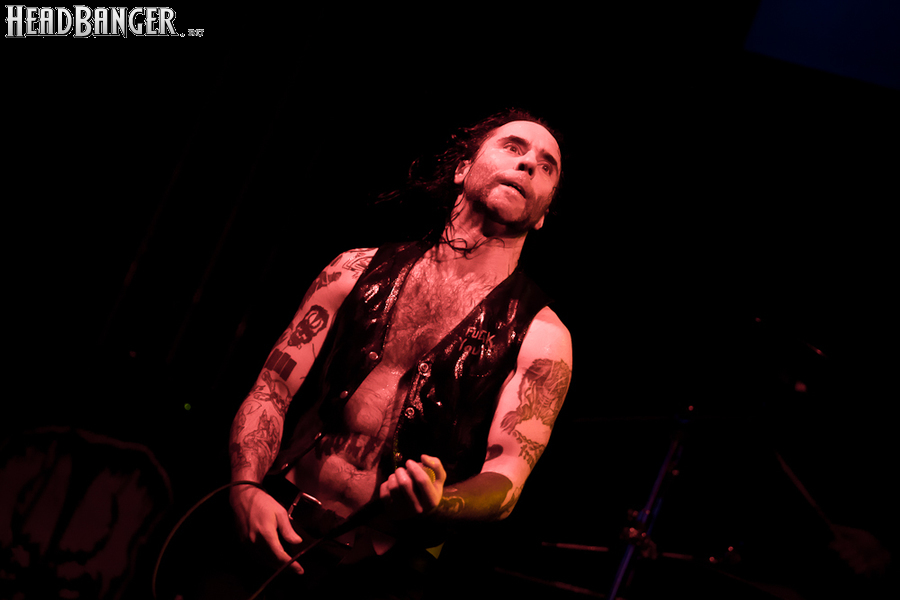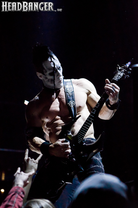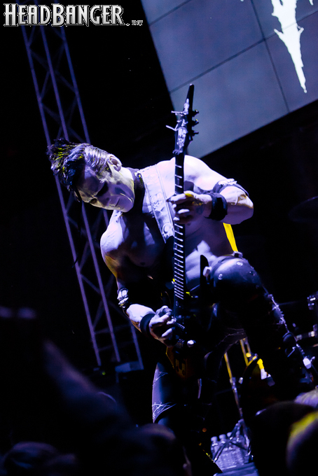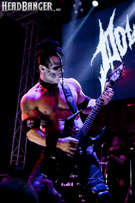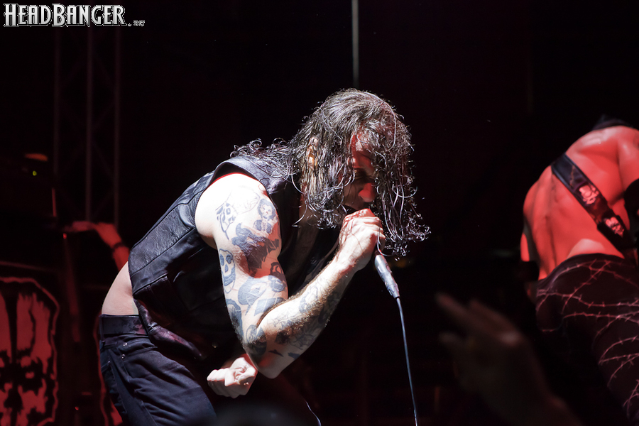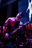 Квартет вышел на сцену без пяти девять. И с места в карьер дал гари. Сам Дойл Вольфгангович оказался единственным, кто нанёс на лицо маску из белого грима и подвёл на её фоне глаза в чёрный цвет. Фирменный девилок – на месте. Мускулатура обнажённого торса говорит о том, что он нехило подкачан. Возможно, не без помощи стероидов, но какая разница? На Франкенштейна Пол был похож не особо. Благодаря проводам беспроводных систем, тянущимся от пятой точки к ушам, он скорее напоминал человекообразного инопланетянина с гитарой. Активный, подвижный и несущий драйв – более и добавить нечего. Практически весь сет Дойл провёл на правом краю сцены. На лицах остальных музыкантах грима не было. Басист Брэндон Стрэйт отлично справлялся с партиями бэк-вокала. Между ними – вокалист Алекс Стори, чудовищно небритый, и (похоже) под шафе. Но последний факт никоим образом не мешал ему отлично справляться со своими партиями, да ещё и попутно взглядами и редкими ударами по рукам общаться с первым (и единственным) рядом публики танцпола. Особого внимания заслуживают его руки: это практически чёрно-белая галерея татуировок с портретами «знаменитых монстров» из старинных хоррор-кинолент, среди которых замечен и «Малиновый призрак», ставший фирменным знаком The Misfits. Барабанщик Уэйд Мёрф, по каким-то причинам заменивший Брэндона Пентцборна то ли на этот тур, то ли вообще (в метал-архивах постоянным драммером значится второй) – машина, цементирующая грув отменного качества, выдаваемый командой. Любо дорого и посмотреть, и послушать. По части звука этот концерт в новом "Москва-Холле" был хоть и не идеален, но уже близок к четвёрке с плюсом из пяти возможных. И среди всех трёх мероприятий, на которых мне там довелось побывать, он оказался по части саунда лучшим.