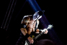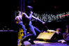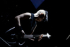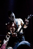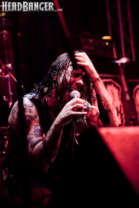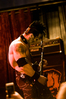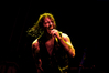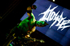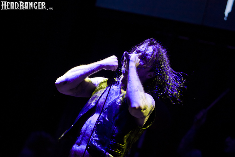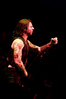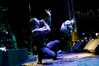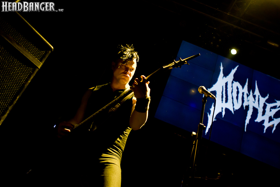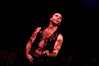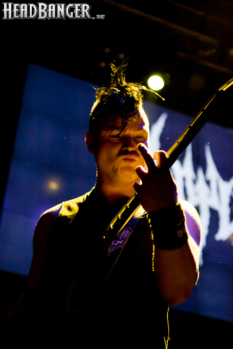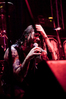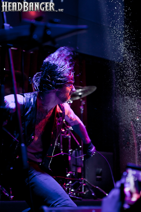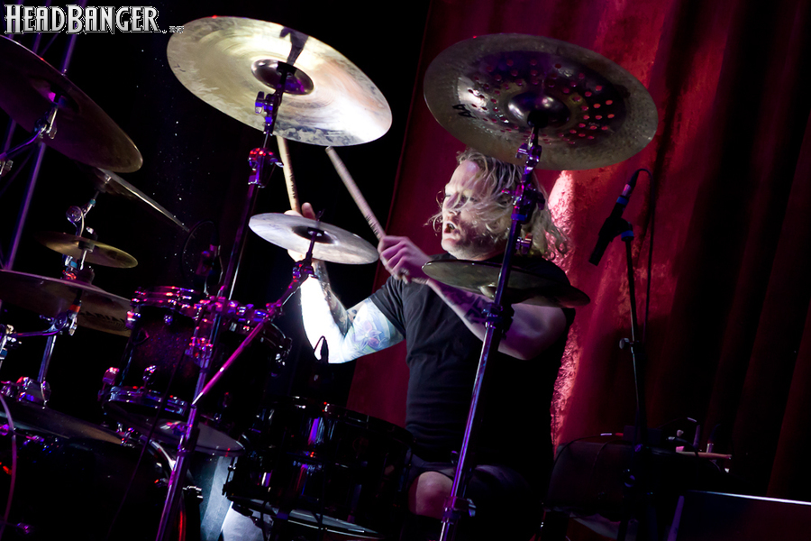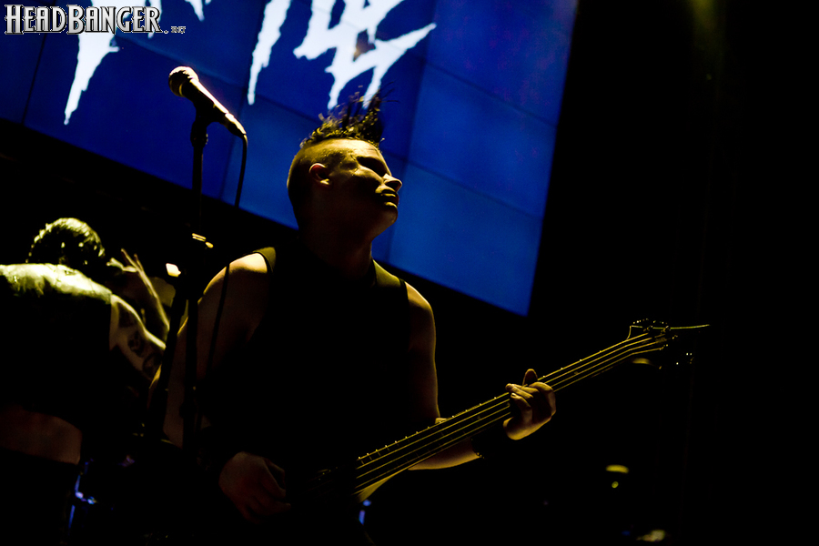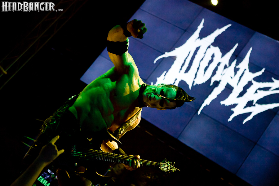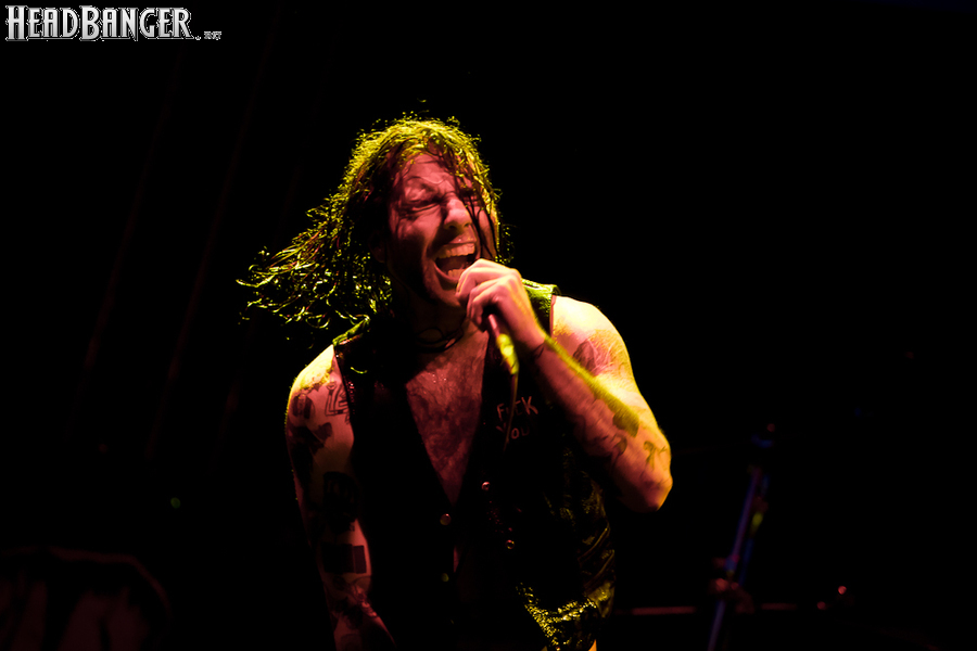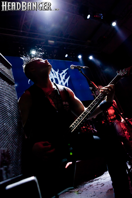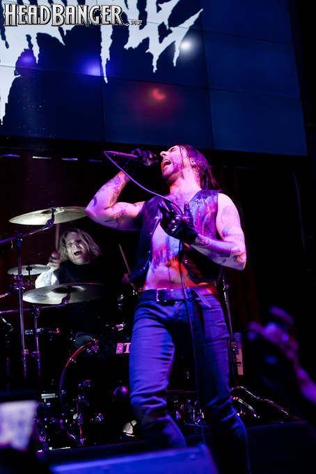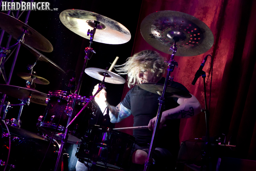 Квартет вышел на сцену без пяти девять. И с места в карьер дал гари. Сам Дойл Вольфгангович оказался единственным, кто нанёс на лицо маску из белого грима и подвёл на её фоне глаза в чёрный цвет. Фирменный девилок – на месте. Мускулатура обнажённого торса говорит о том, что он нехило подкачан. Возможно, не без помощи стероидов, но какая разница? На Франкенштейна Пол был похож не особо. Благодаря проводам беспроводных систем, тянущимся от пятой точки к ушам, он скорее напоминал человекообразного инопланетянина с гитарой. Активный, подвижный и несущий драйв – более и добавить нечего. Практически весь сет Дойл провёл на правом краю сцены. На лицах остальных музыкантах грима не было. Басист Брэндон Стрэйт отлично справлялся с партиями бэк-вокала. Между ними – вокалист Алекс Стори, чудовищно небритый, и (похоже) под шафе. Но последний факт никоим образом не мешал ему отлично справляться со своими партиями, да ещё и попутно взглядами и редкими ударами по рукам общаться с первым (и единственным) рядом публики танцпола. Особого внимания заслуживают его руки: это практически чёрно-белая галерея татуировок с портретами «знаменитых монстров» из старинных хоррор-кинолент, среди которых замечен и «Малиновый призрак», ставший фирменным знаком The Misfits. Барабанщик Уэйд Мёрф, по каким-то причинам заменивший Брэндона Пентцборна то ли на этот тур, то ли вообще (в метал-архивах постоянным драммером значится второй) – машина, цементирующая грув отменного качества, выдаваемый командой. Любо дорого и посмотреть, и послушать. По части звука этот концерт в новом "Москва-Холле" был хоть и не идеален, но уже близок к четвёрке с плюсом из пяти возможных. И среди всех трёх мероприятий, на которых мне там довелось побывать, он оказался по части саунда лучшим.